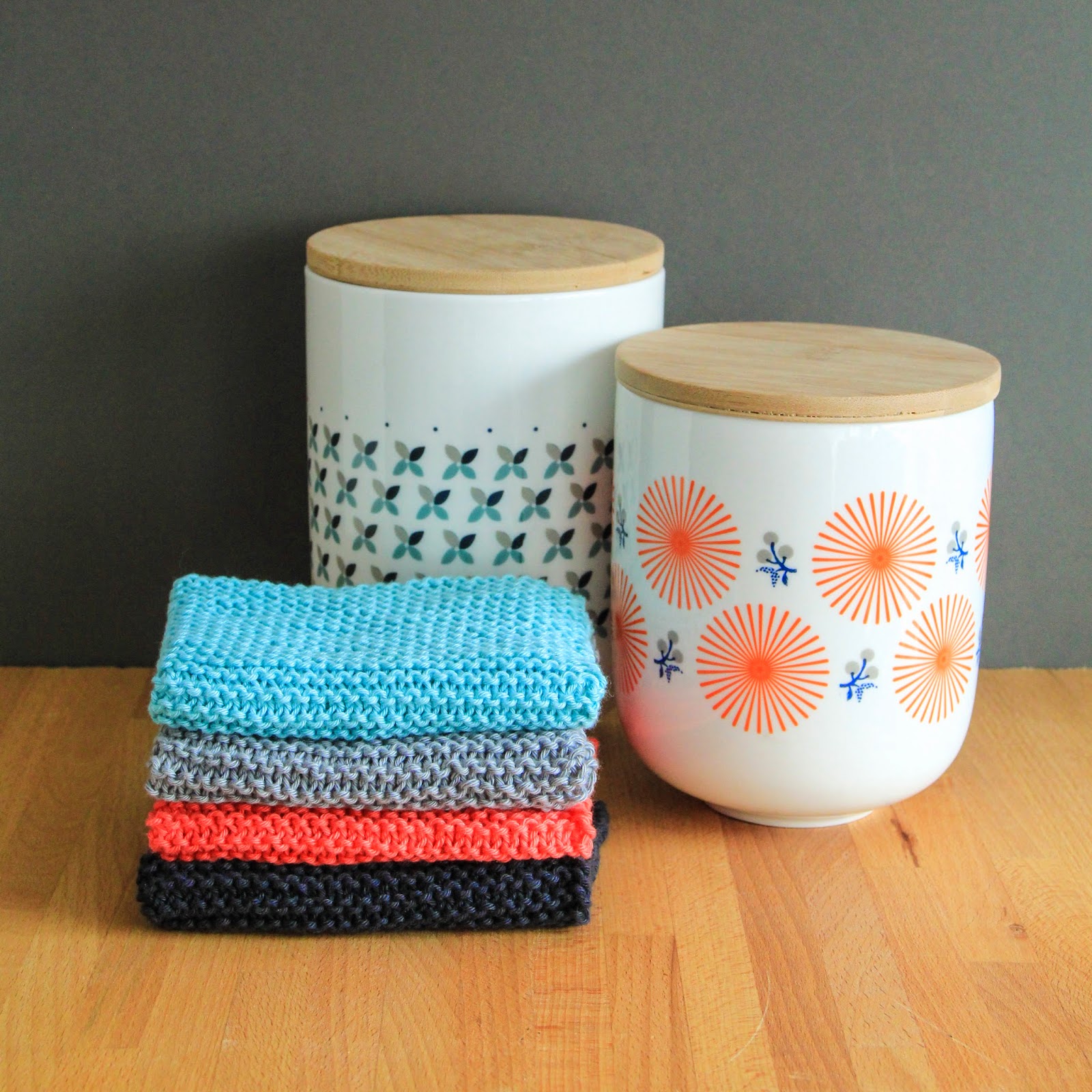 Our new Retro Designed canisters make great kitchen storage, but they would also look lovely in a bathroom to keep all those little bits and pieces tidy. To go with the canisters you could knit a set of face cloths in coordinating colours. I have used Rico Essential Cotton Soft as it had the shades closest to the designs, I used Melon, Anthracite and Smoke. However, you could use any double knitting cotton.