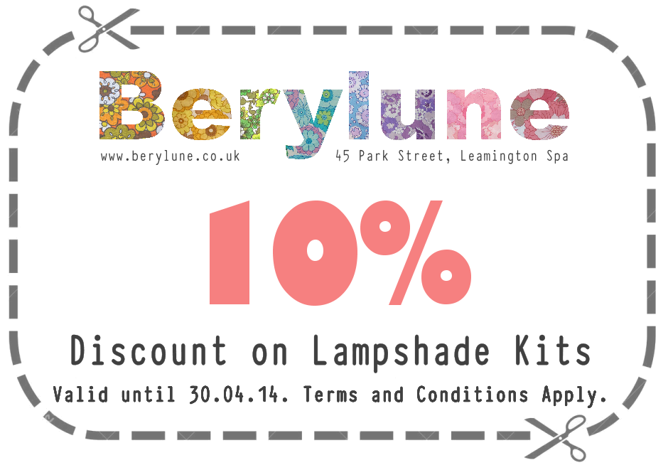 Present the voucher below to get 10% discount on lampshade kit purchases until the end of April - the 20cm kit used for this shade is usually £9.95. If you you're a bit nervous about having a go at this by yourself, why not book a place on one of our workshops? (New dates coming soon)
