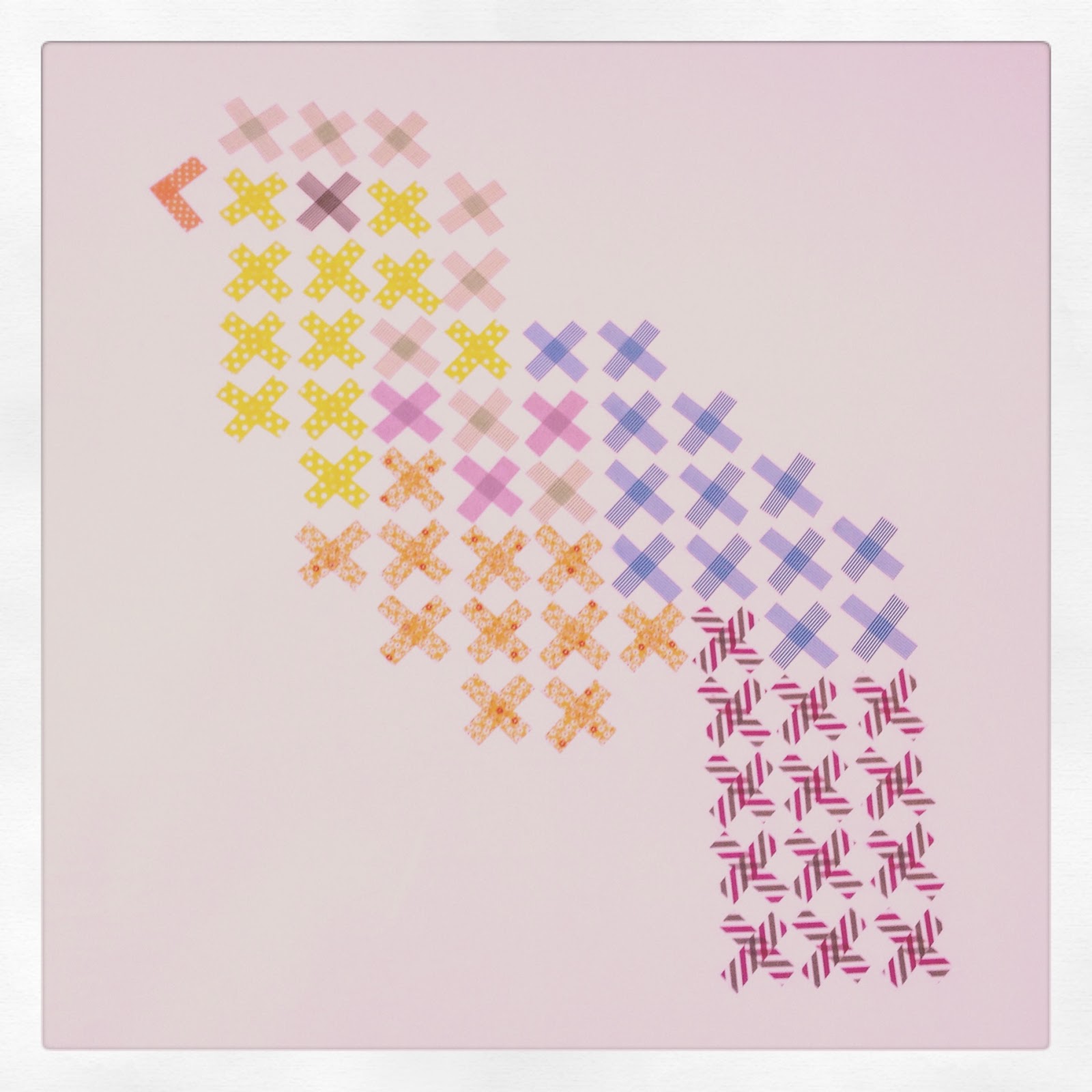 Zoë mostly made this pattern up, but you could copy a simple cross stitch pattern to make a temporary mural on your wall. We used a template to make sure all the bits were roughly the same length.