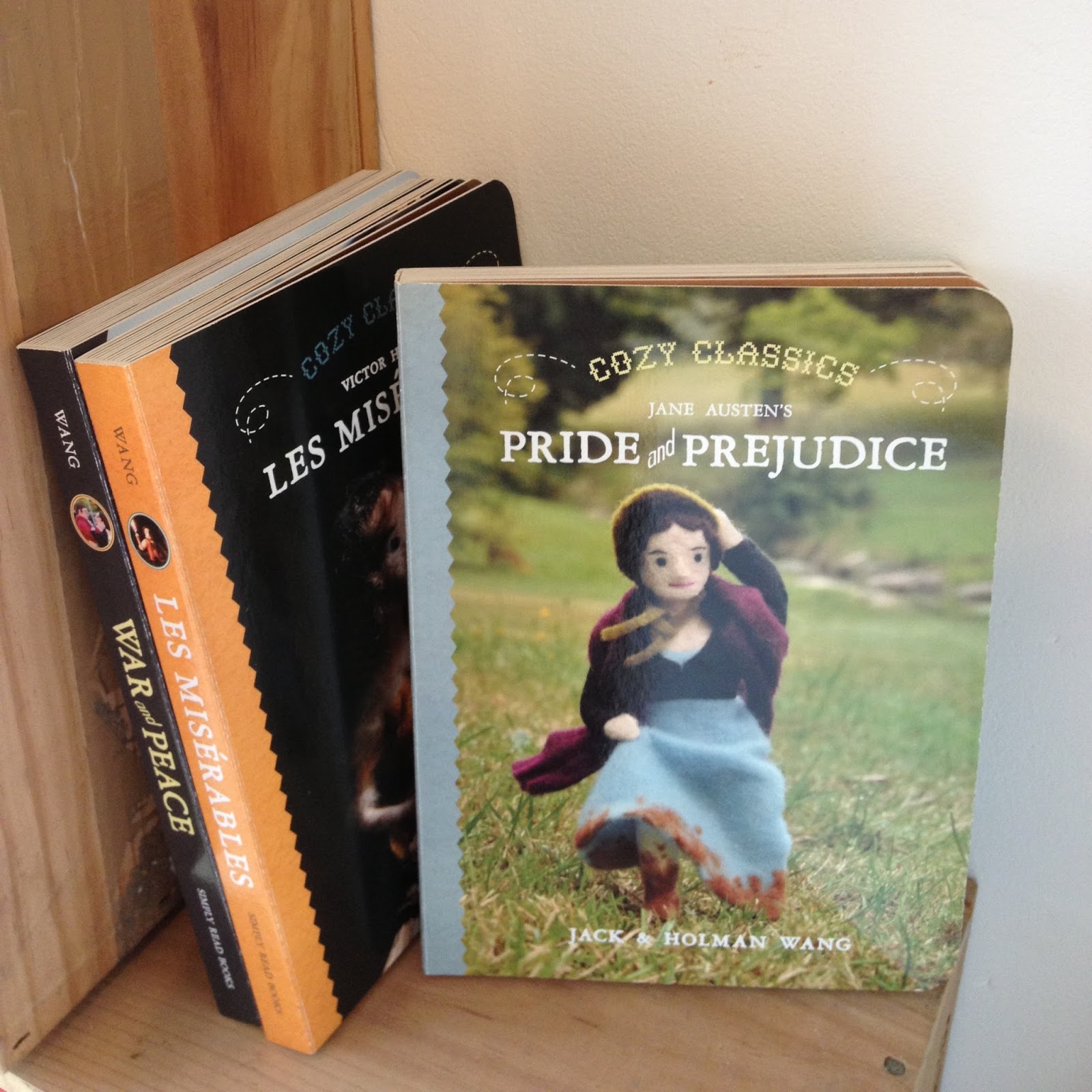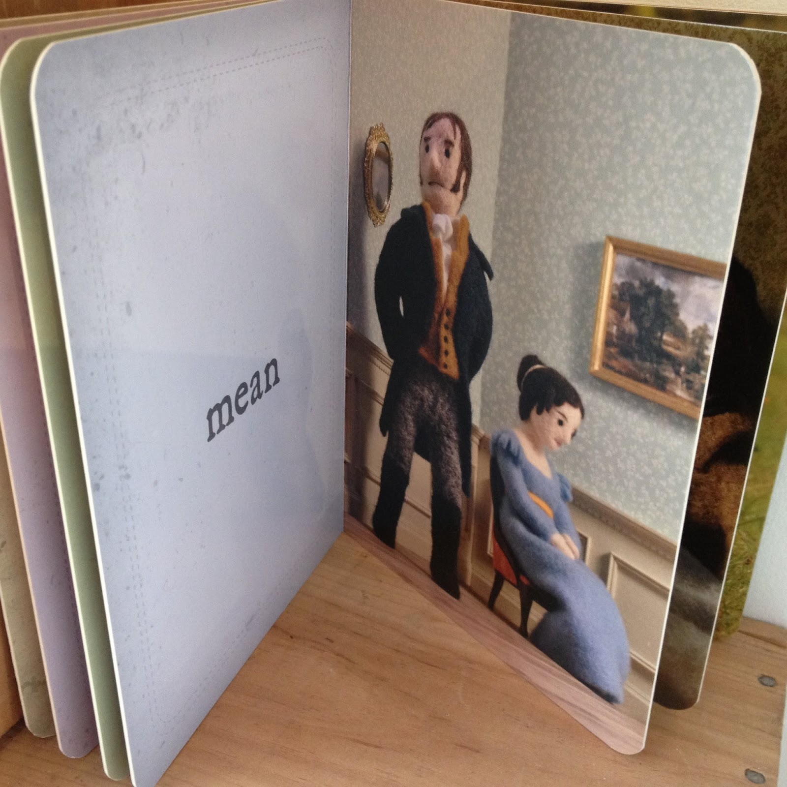 It's by Cozy Classics and sums up Pride and Prejudice in just 12 words! Each word is accompanied by a beautiful picture of needle felted characters in an appropriate scene. I suppose, with their thick card pages, these are supposed to be for young children to enjoy? However, we're all fully grown adults and think they're amazing! Here is Elizabeth and Mr Darcy, he is clearly being mean.