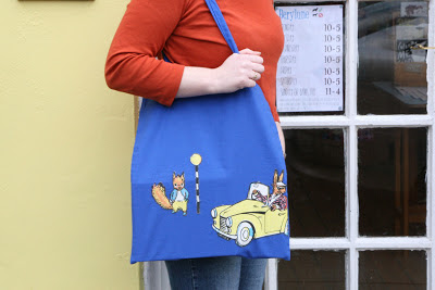 They have been in our stores, waiting for a project, since we opened last May. Finally, Amy has sewn them on to brightly coloured book bags (red, orange, yellow and blue, in that order), which are now for sale in our shop!