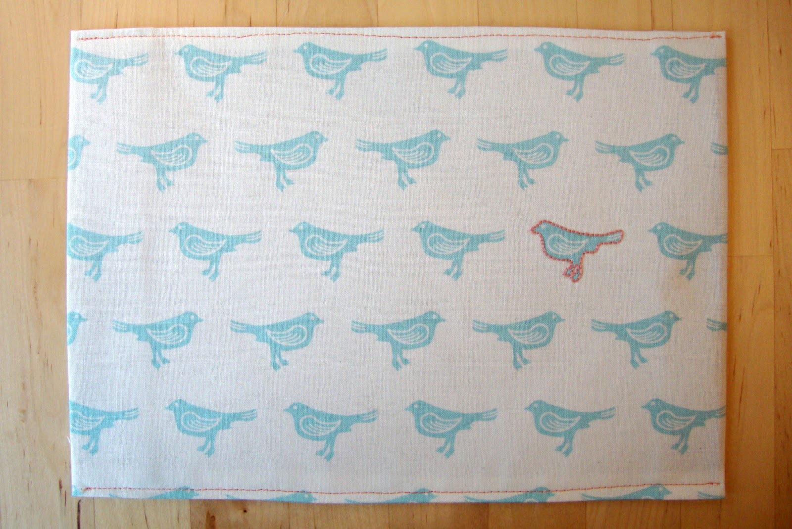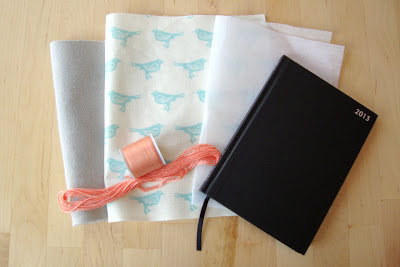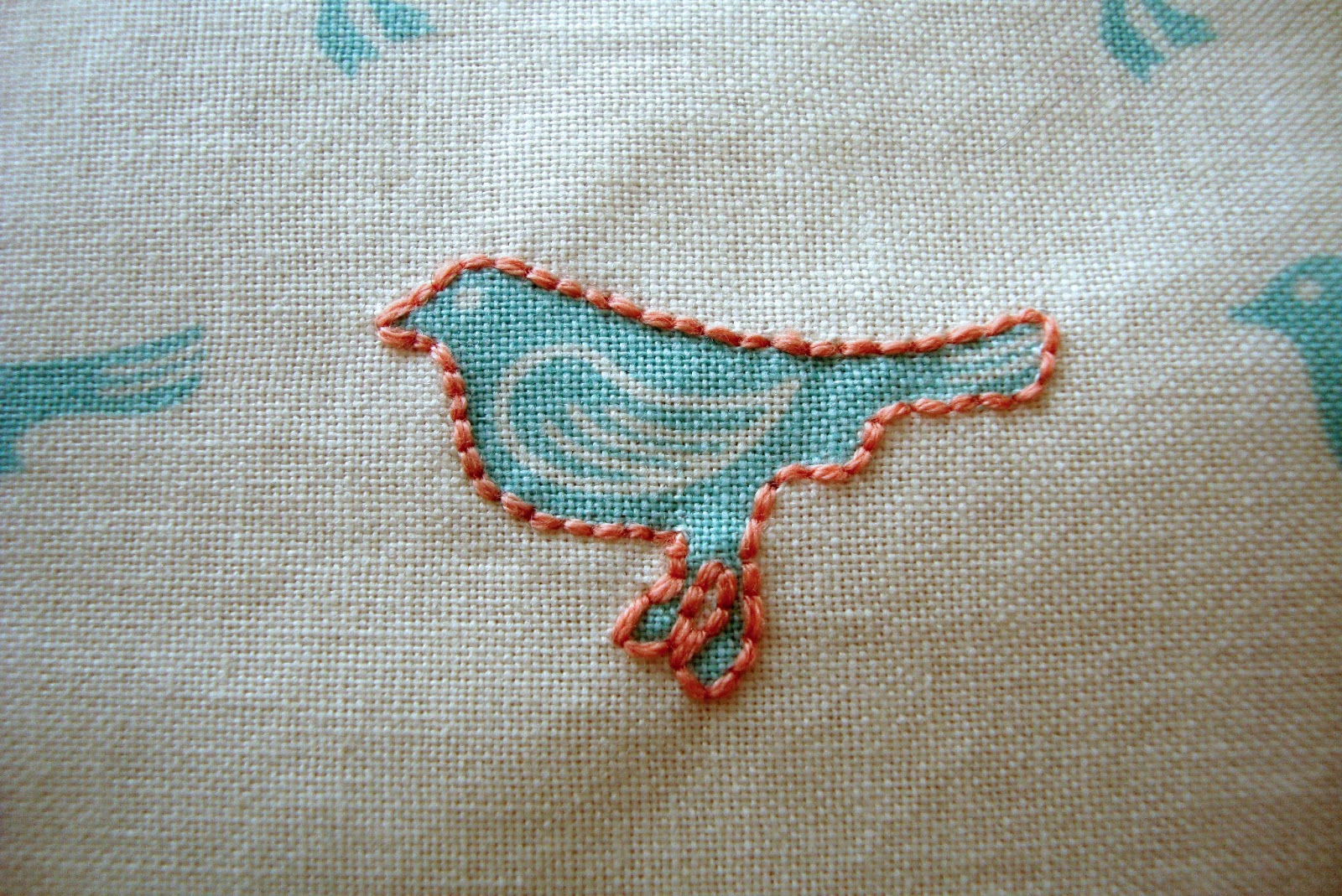 4. If you wish, embellish the front of your book; Amy has stitched around one of the birds on the fabric in a contrasting colour of embroidery floss. You could stitch your initials, the year or a subject for your notebook.
