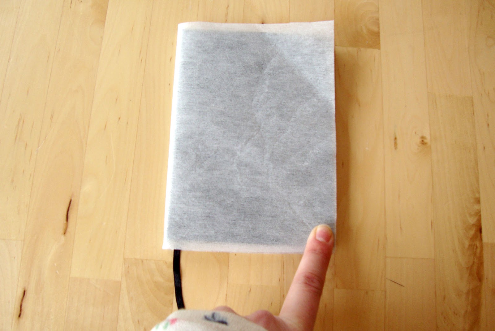 1. Measure and cut your interfacing to to fit the notebook - it needs to be 1cm taller than the book both top and bottom, and be level with the edges of the closed book, taking the spine depth in to account. Cut the felt to the same size as your interfacing.