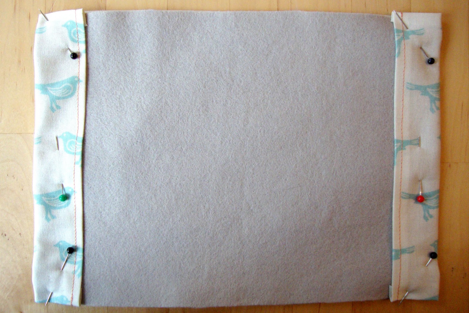 8. Fold the two 3cm flaps of fabric on either side of your fabric sandwhich to the edge of the felt and pin in place. These will form the pockets that the cover of your book will slip in to.