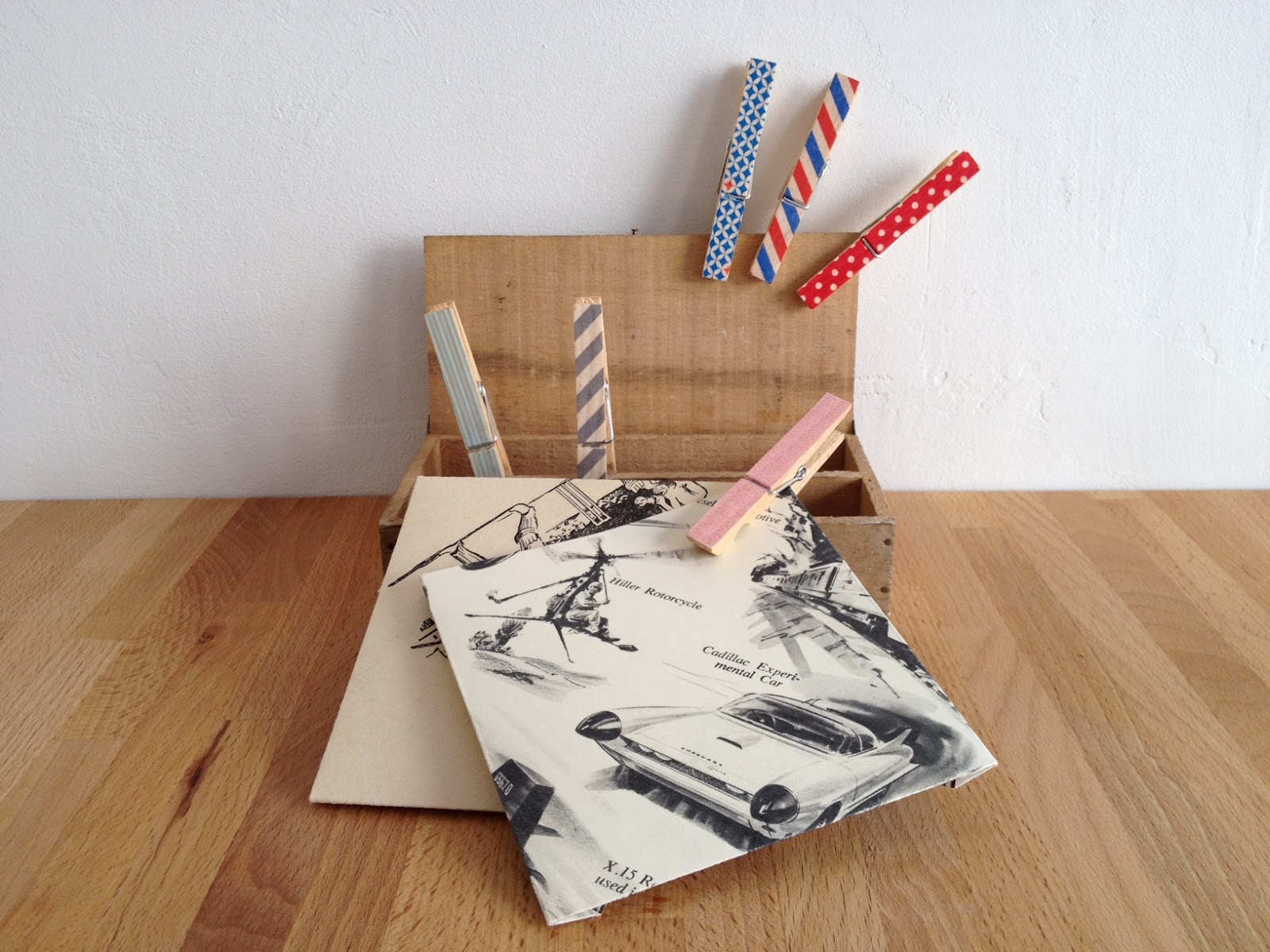 Washi covered pegs! Great for organising your desk. Or pegging to the front of your greetings card display shelves, like we have in store...