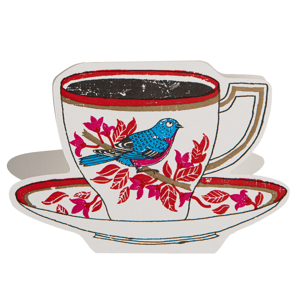 letterpress cut-out card featuring an elegant tea cup and saucer with a little blue bird on the front. Designed by Charlotte Farmer.