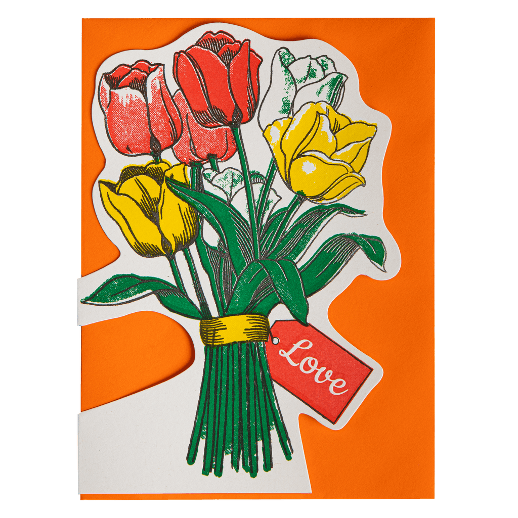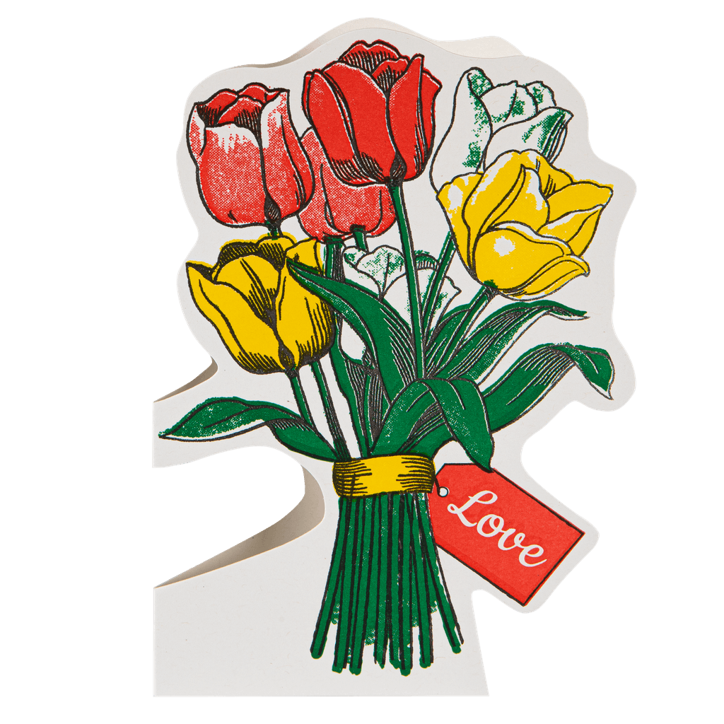 A letterpress cut-out card featuring a bunch of colourful tulips with a tag that reads 'love.'