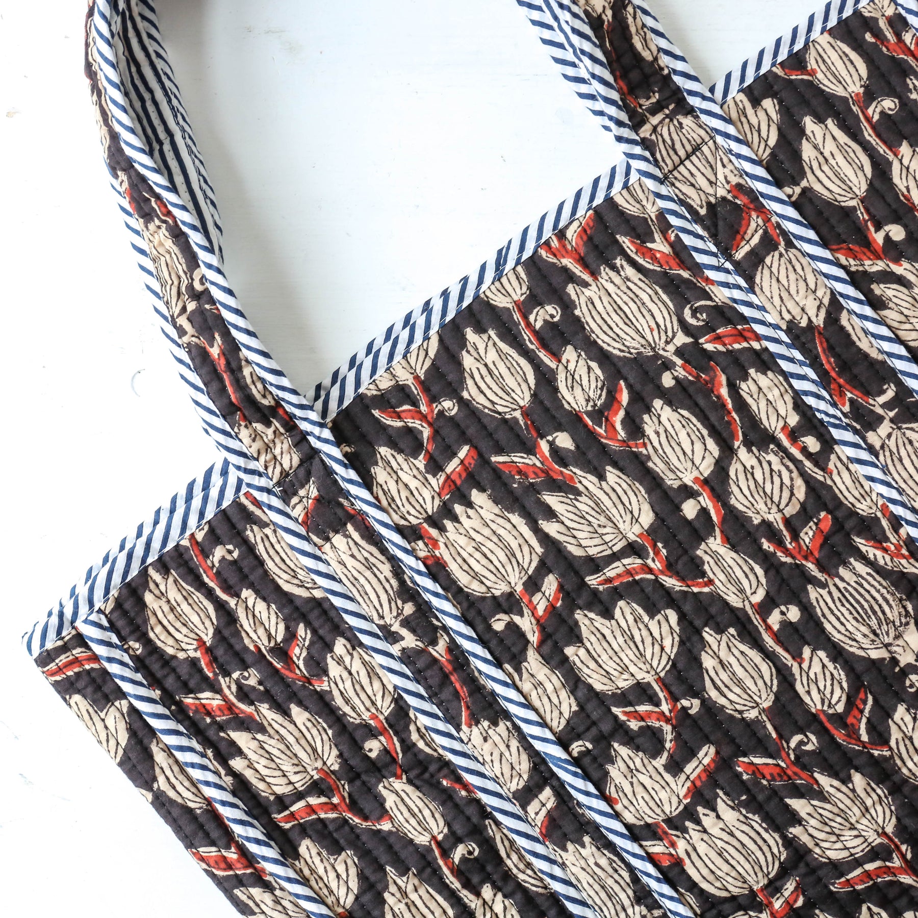 Small quilted cotton shoulder/tote bag with side pockets, made from beautiful block printed Indian cotton.