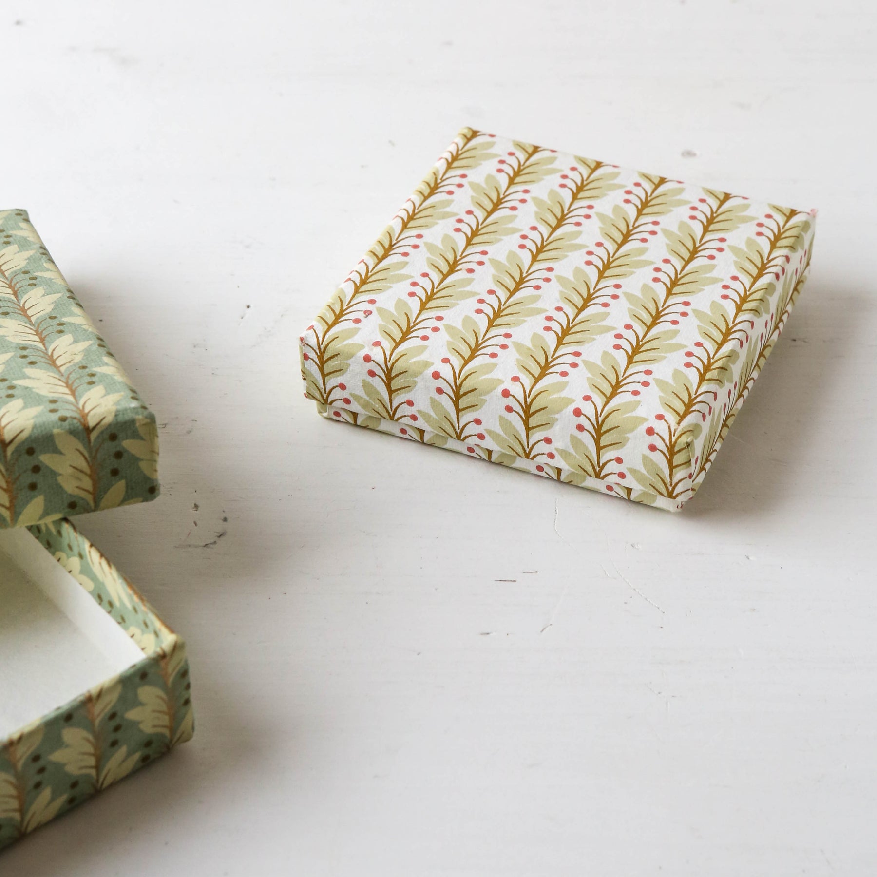 These beautiful paper covered boxes are excellent for tidying away bits and pieces on open shelving, or maybe for giving an extra special gift!