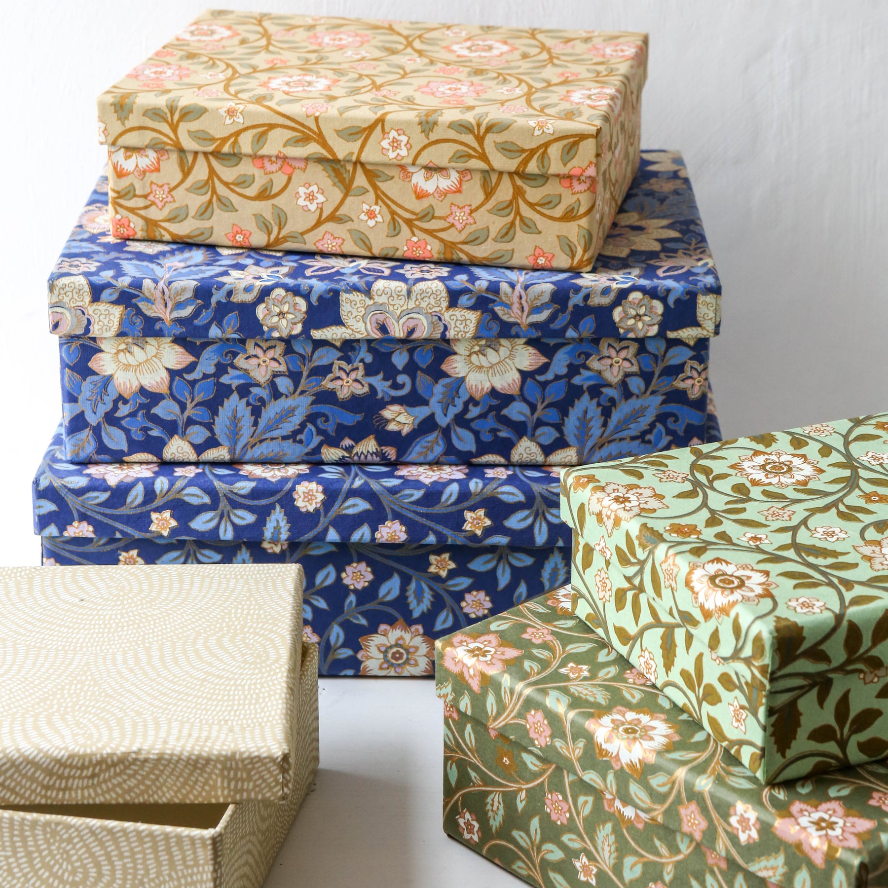 These beautiful paper covered boxes are excellent for tidying away bits and pieces on open shelving, or maybe for giving an extra special gift!