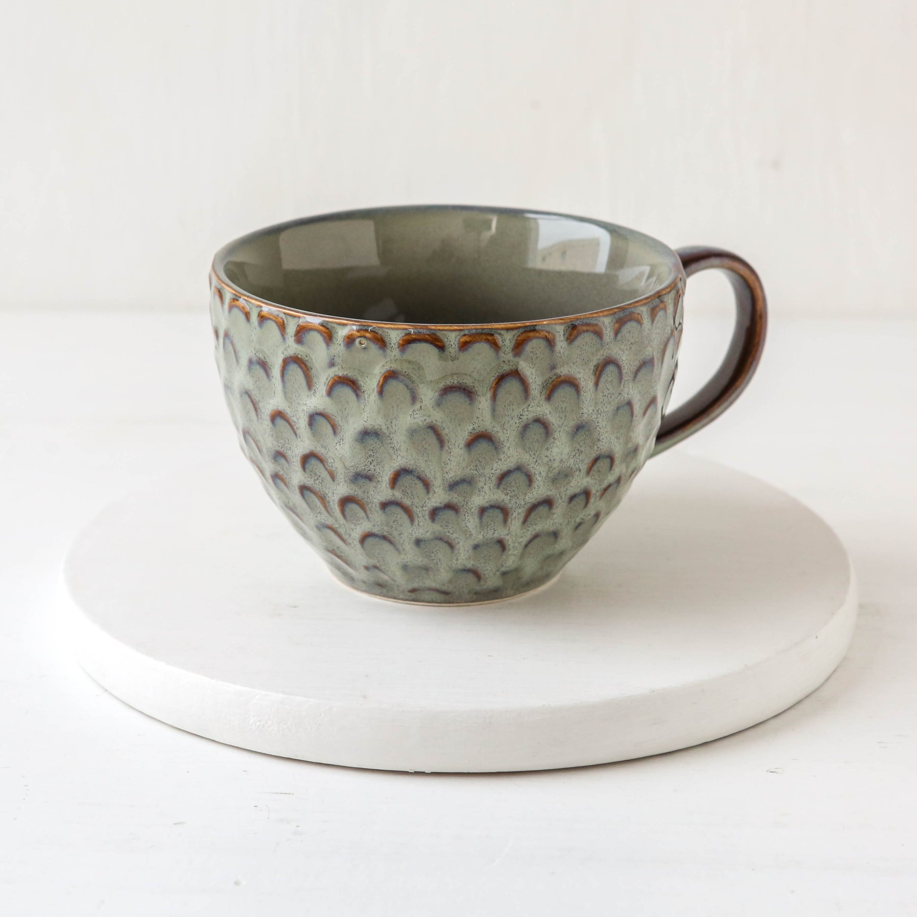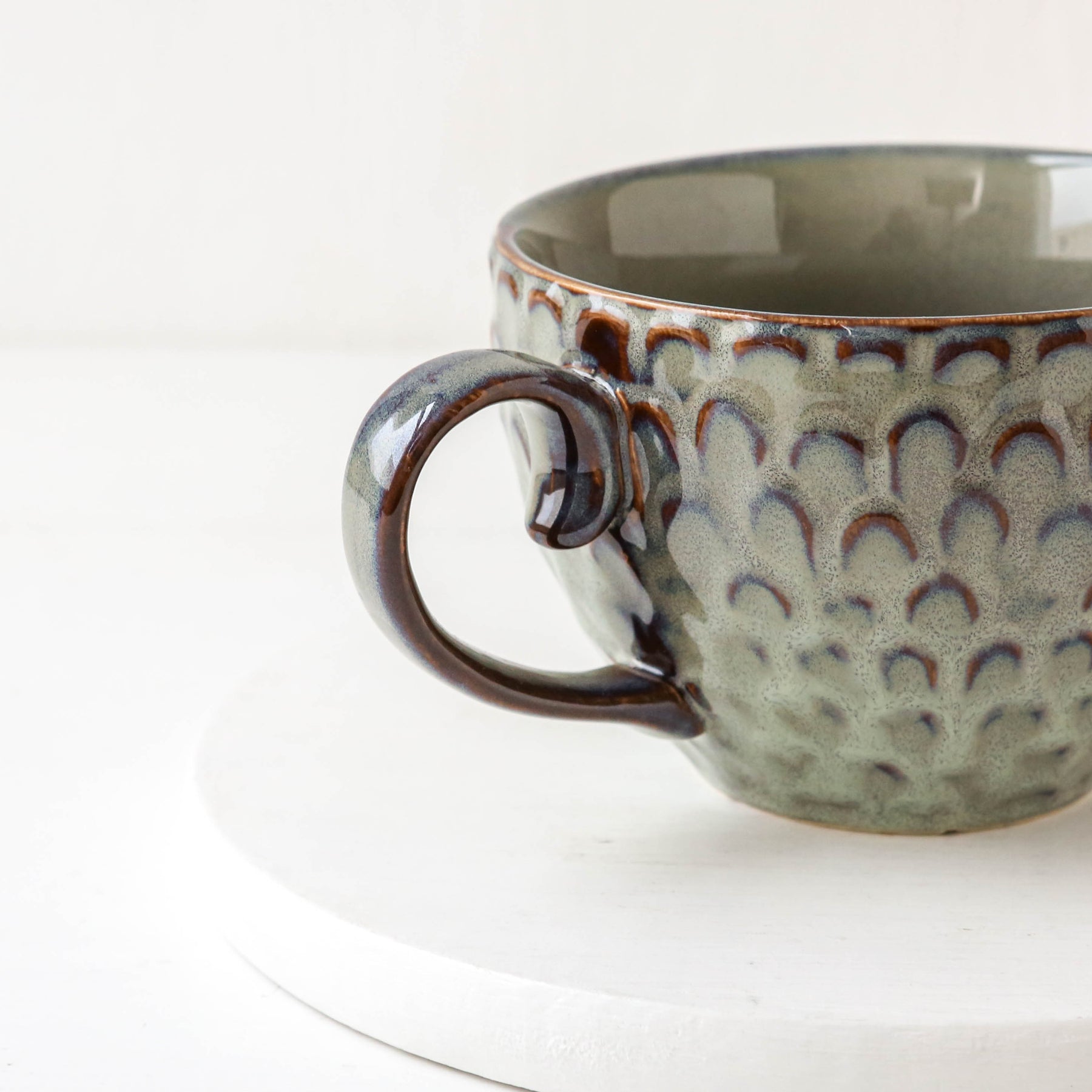 The Katrina Cup is made of stoneware with a reactive glaze that gives each surface a scale like texture. Subtle grey tones are accented along the edges.