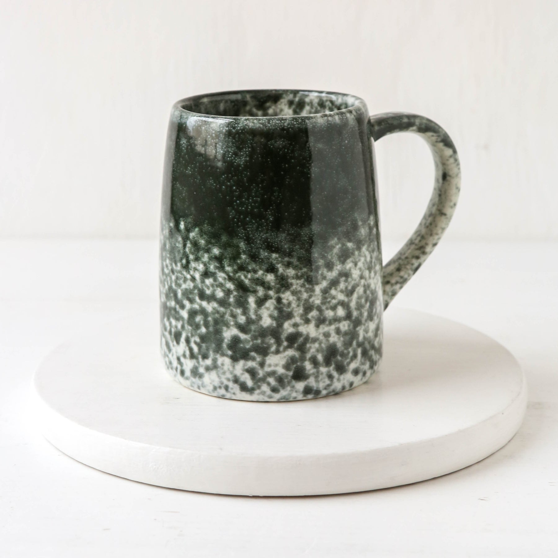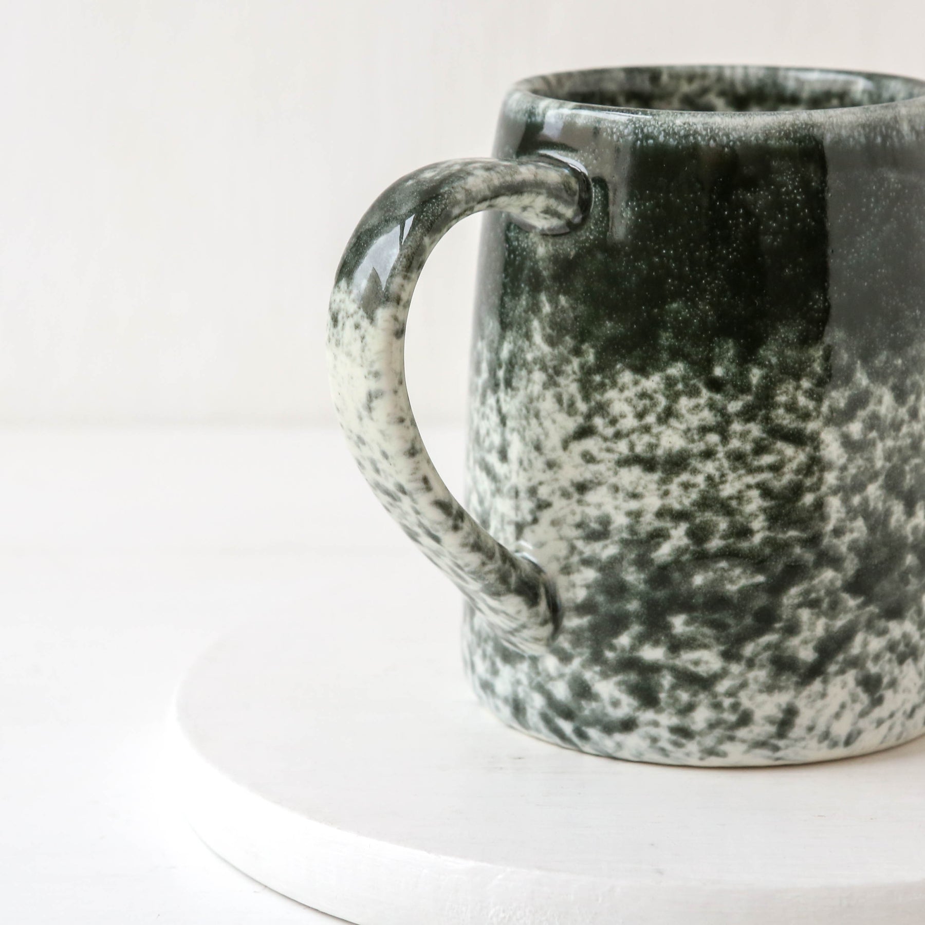 The Winnie Mug by Bloomingville is made of stoneware with a reactive glaze featuring a marbled blend of deep green and off-white.
