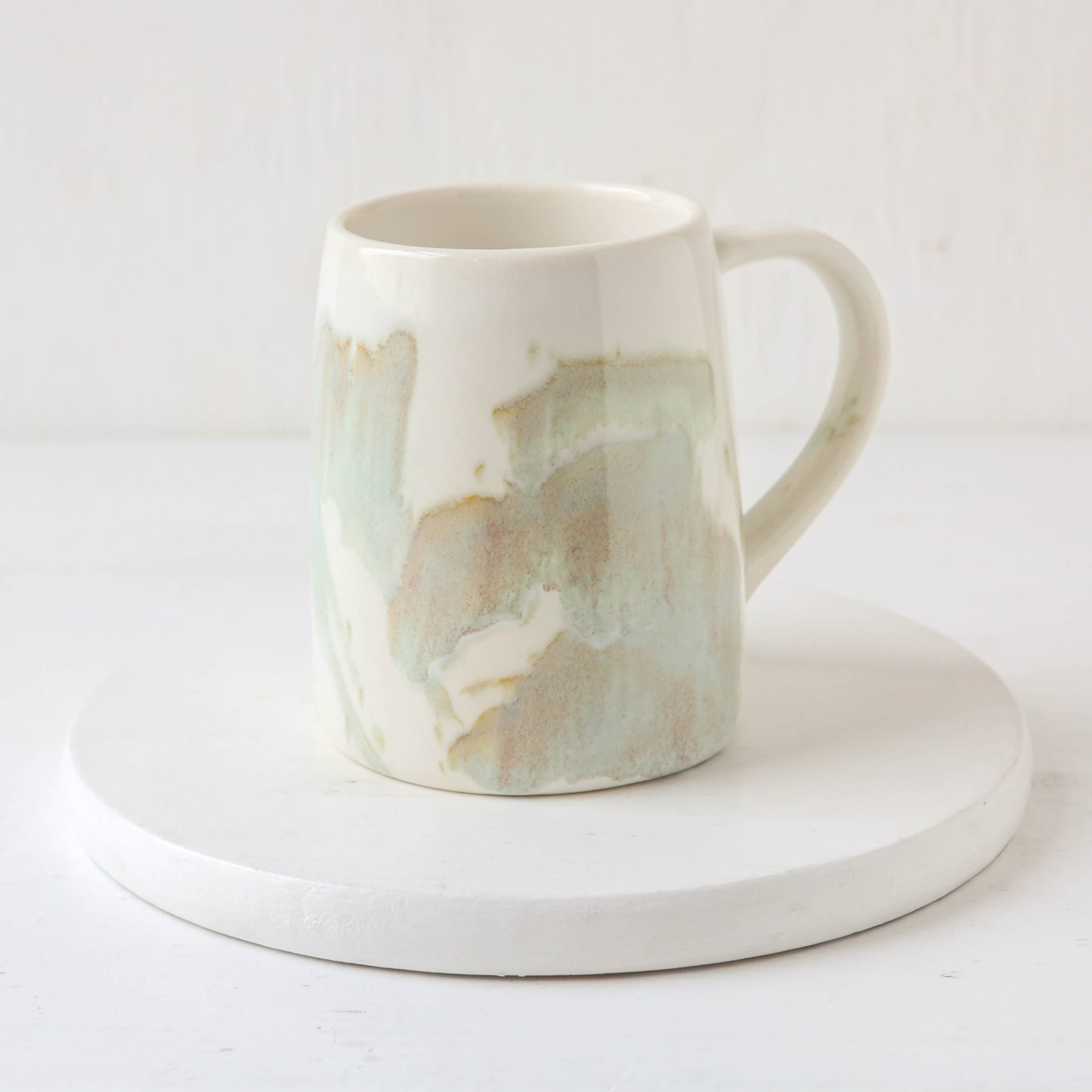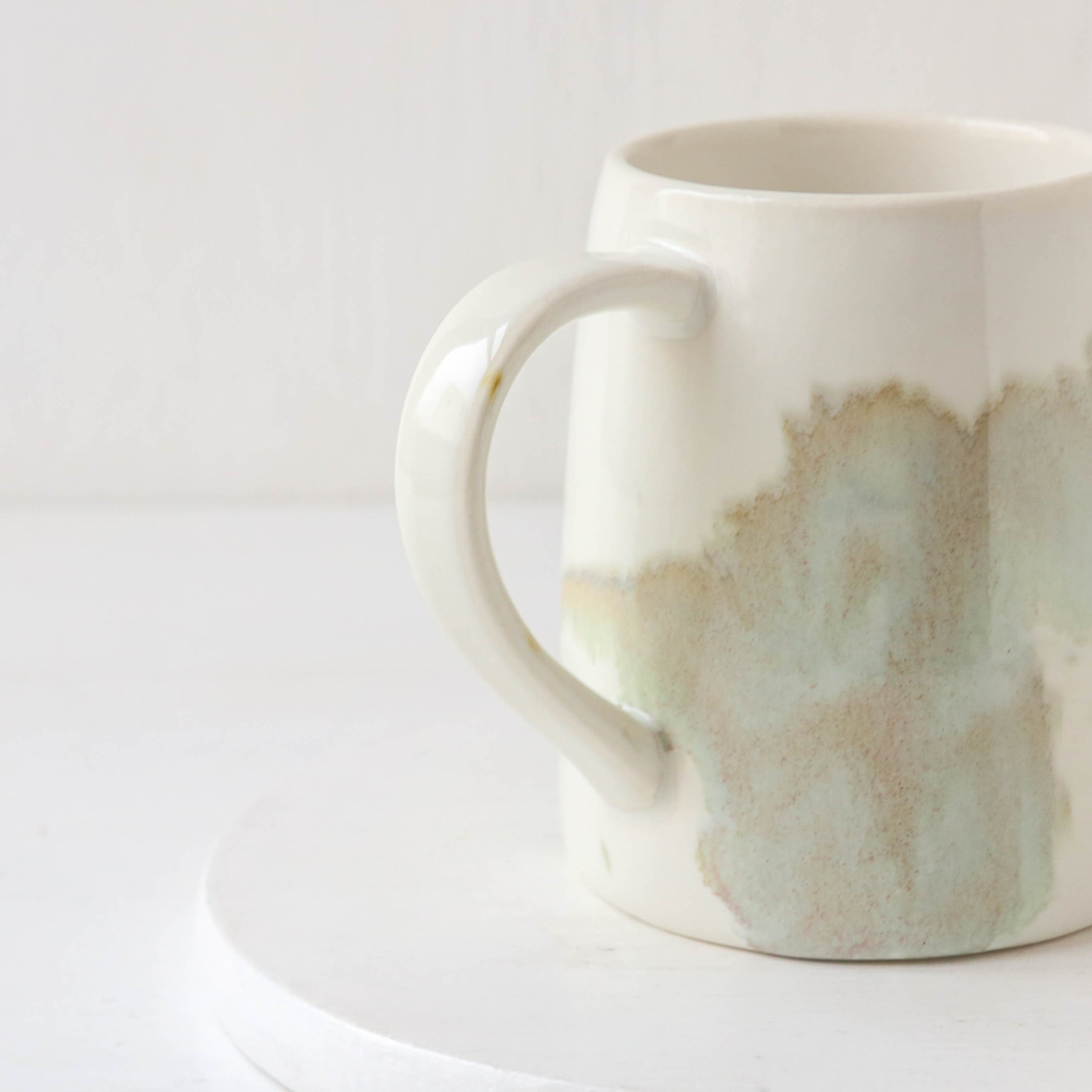 The reactive glaze creates natural colour variations, adding an authentic charm to each mug. When not in use, the mug serves as a decorative detail on a mug rack in the kitchen, contributing to a cosy atmosphere.