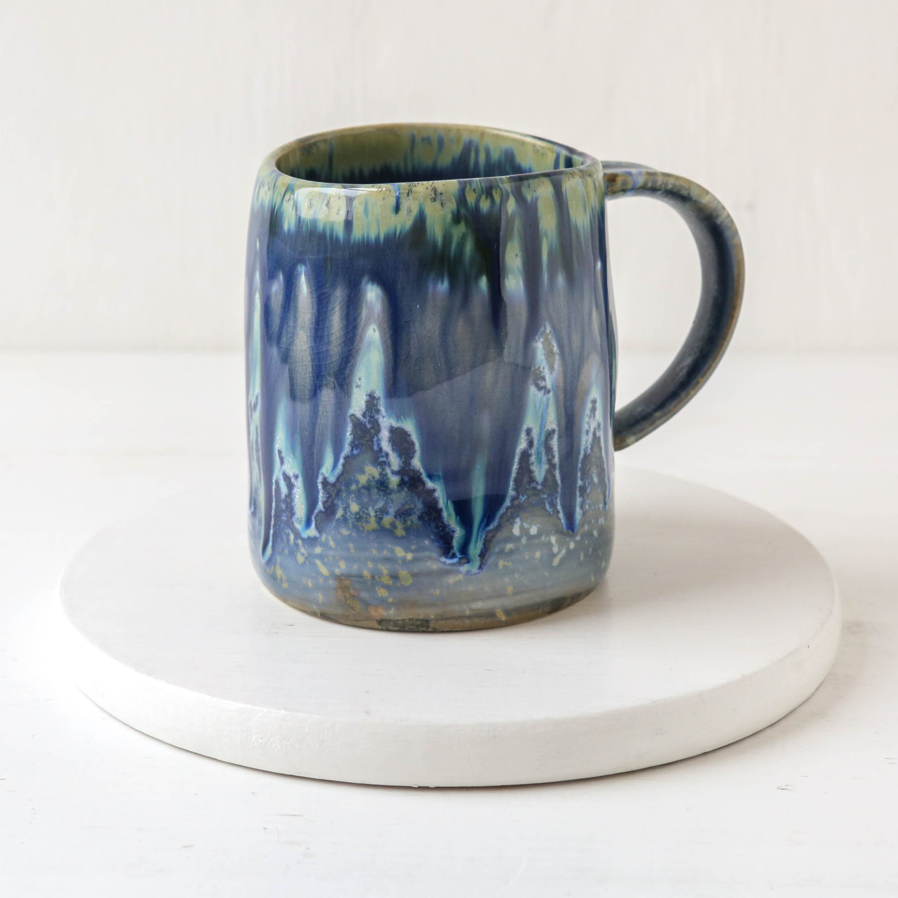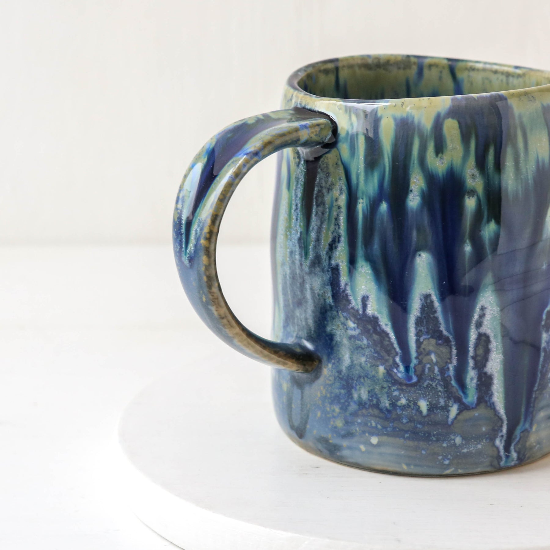 The Yori Mug by Bloomingville is made of stoneware with a reactive glaze in blue and white tones. The reactive glaze creates natural colour variations, adding an authentic charm to each mug. When not in use, the mug serves as a decorative detail on a mug rack in the kitchen, contributing to a cosy atmosphere.