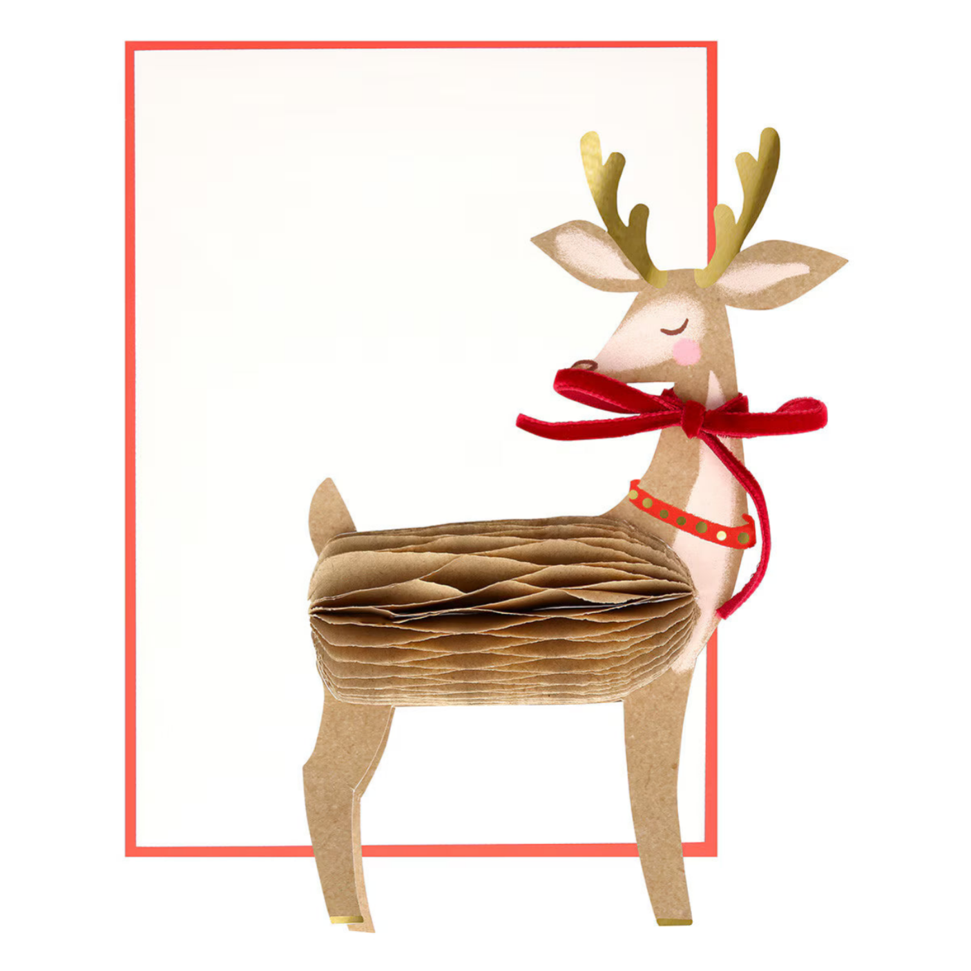 Why settle for a plain Christmas card when you can share your seasonal greetings with one that doubles as a charming reindeer decoration? With honeycomb tissue paper, a chic red velvet bow and shiny gold foil antlers and hooves, it's guaranteed to get pride of place on the mantel or card display!