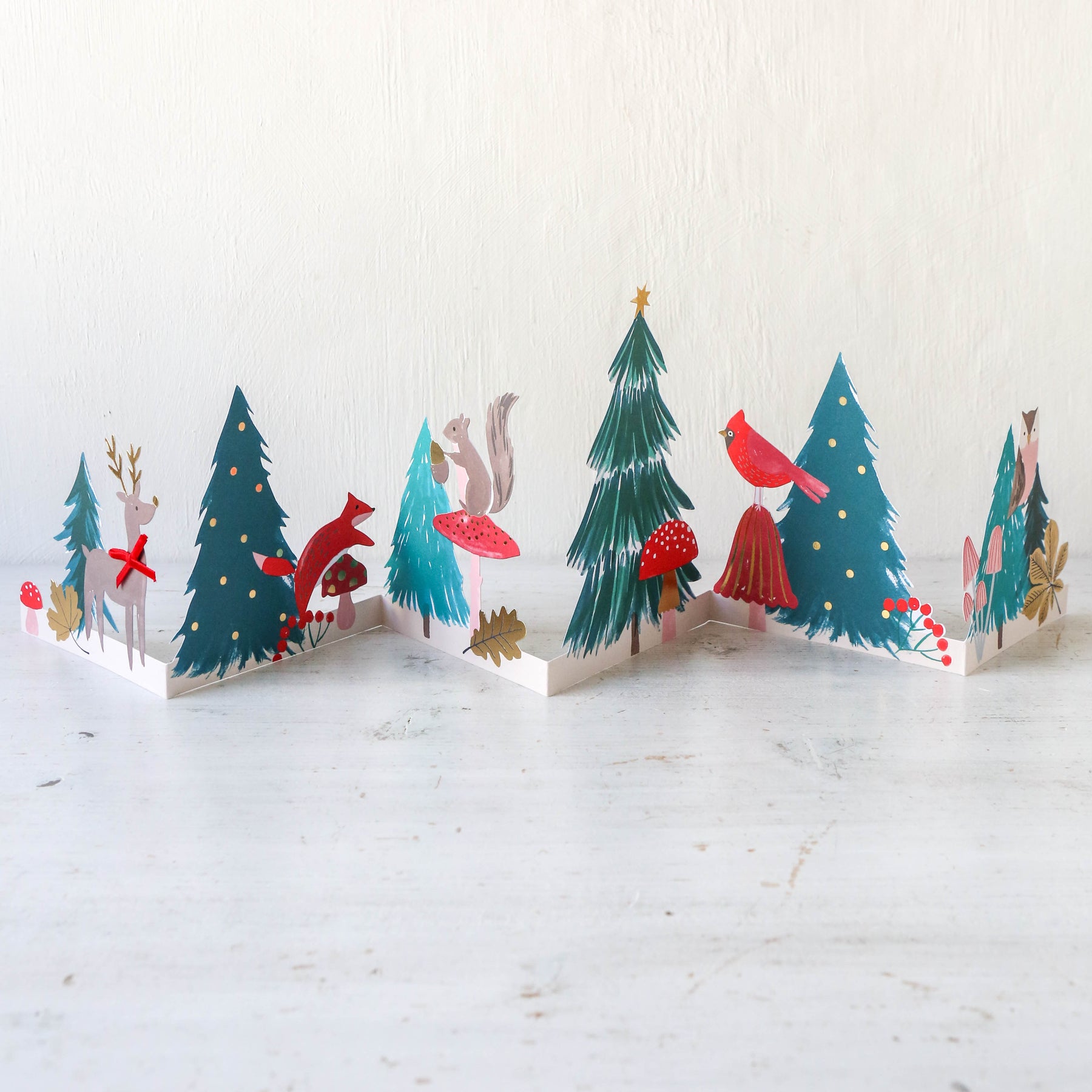 Why have a plain card when you can have one that opens out into a striking Christmas decoration on your mantel? This card, featuring winter woodland flora and fauna and a shiny gold foil star topped Christmas tree, is perfect to send your best wishes to a special someone. The beautiful bow on the reindeer's neck adds a wonderful touch too, making this a Christmas display you'll want to bring out year after year.