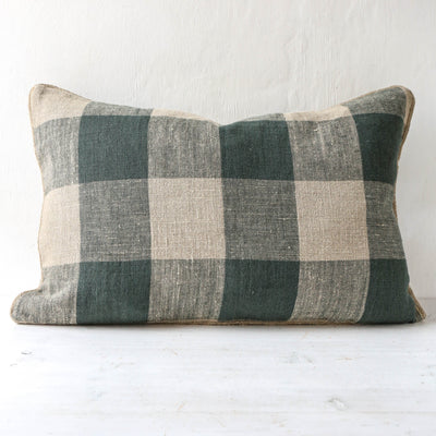 A 100% gingham check linen cushion cover with contrasting natural linen piped edges.