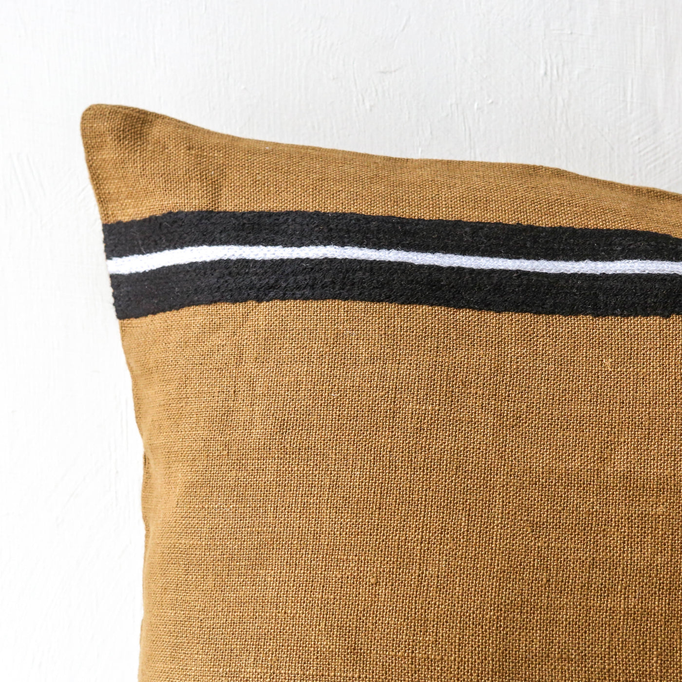 A 100% linen cushion cover with contrasting cotton embroidered stripes.
