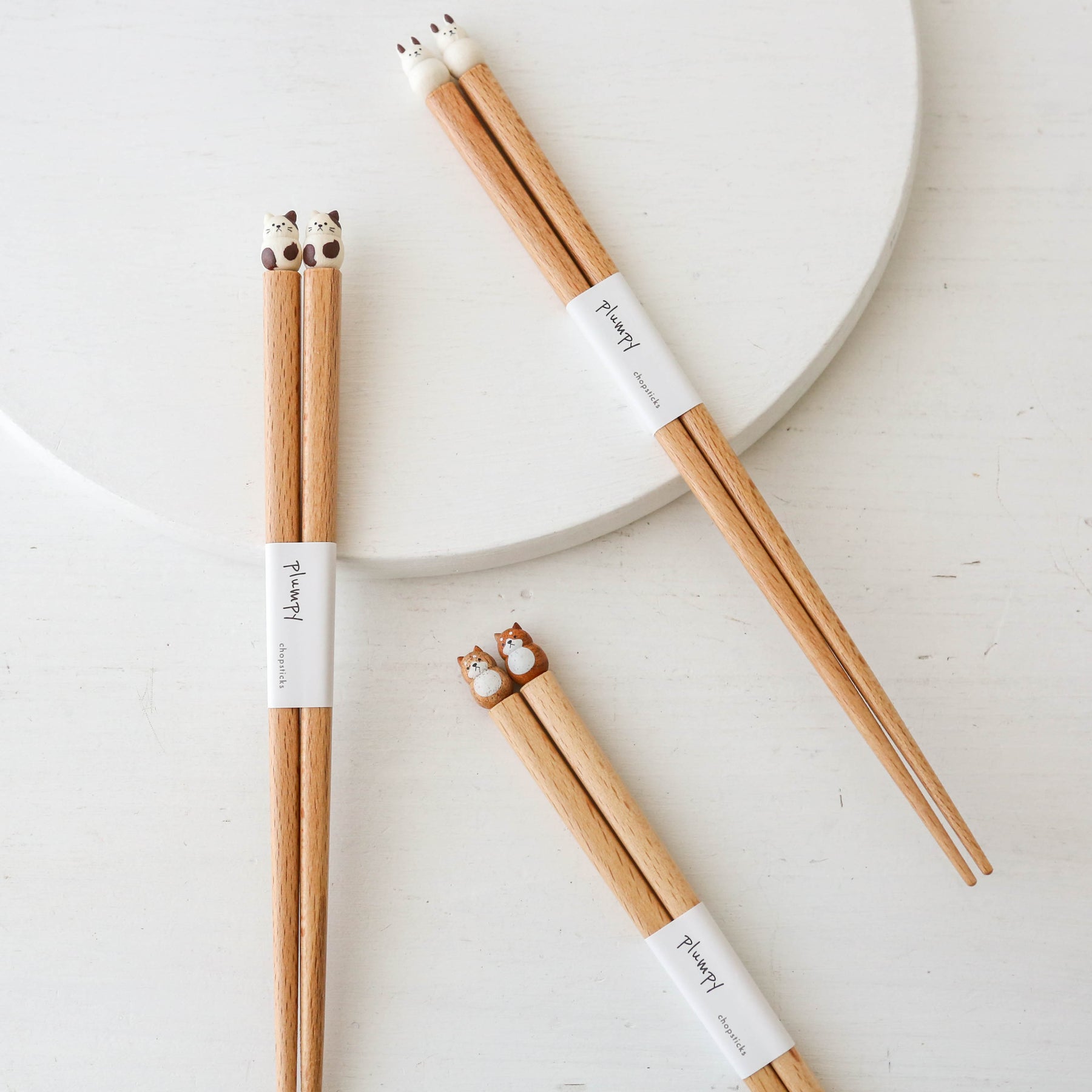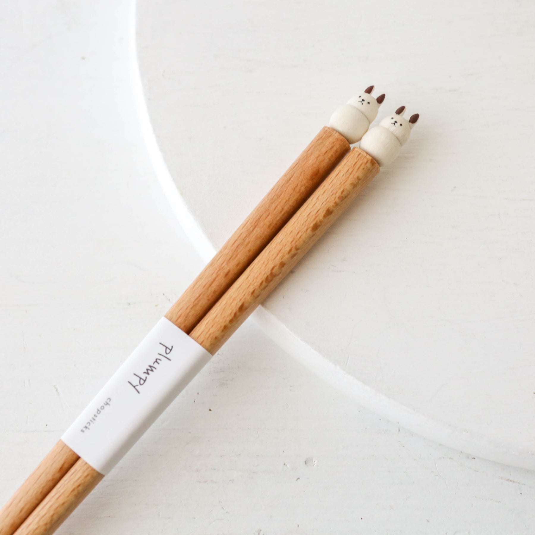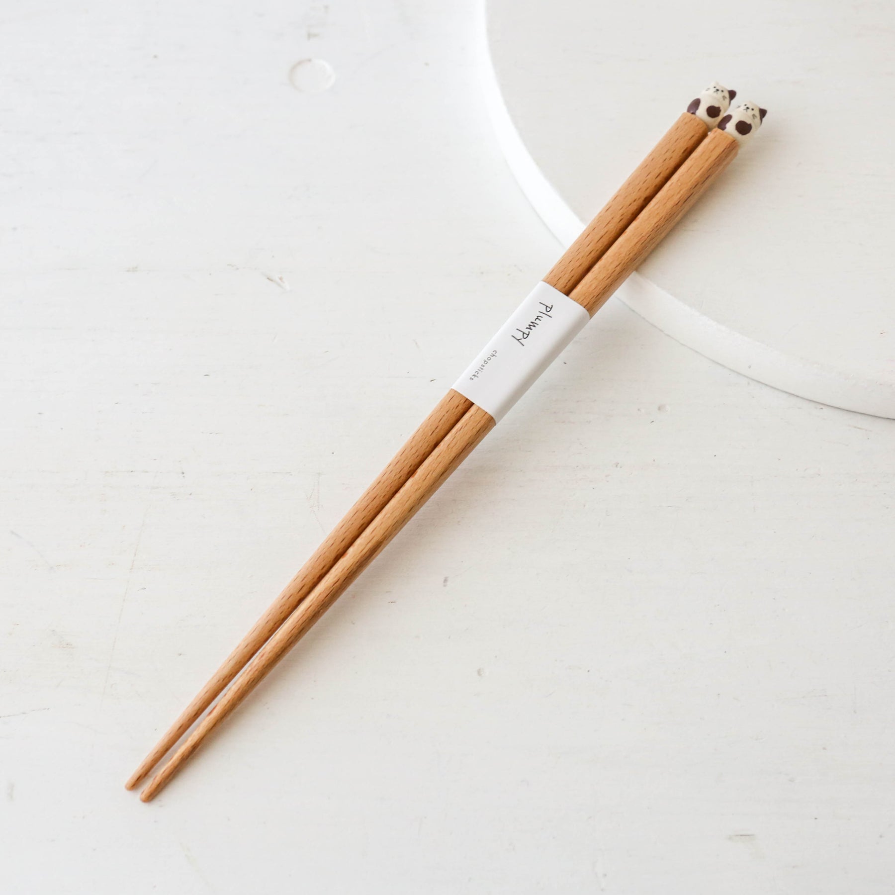 A single pair of adorable wooden chopsticks, topped with a pair of cute, hand painted plump animals, to keep you company whilst you eat.