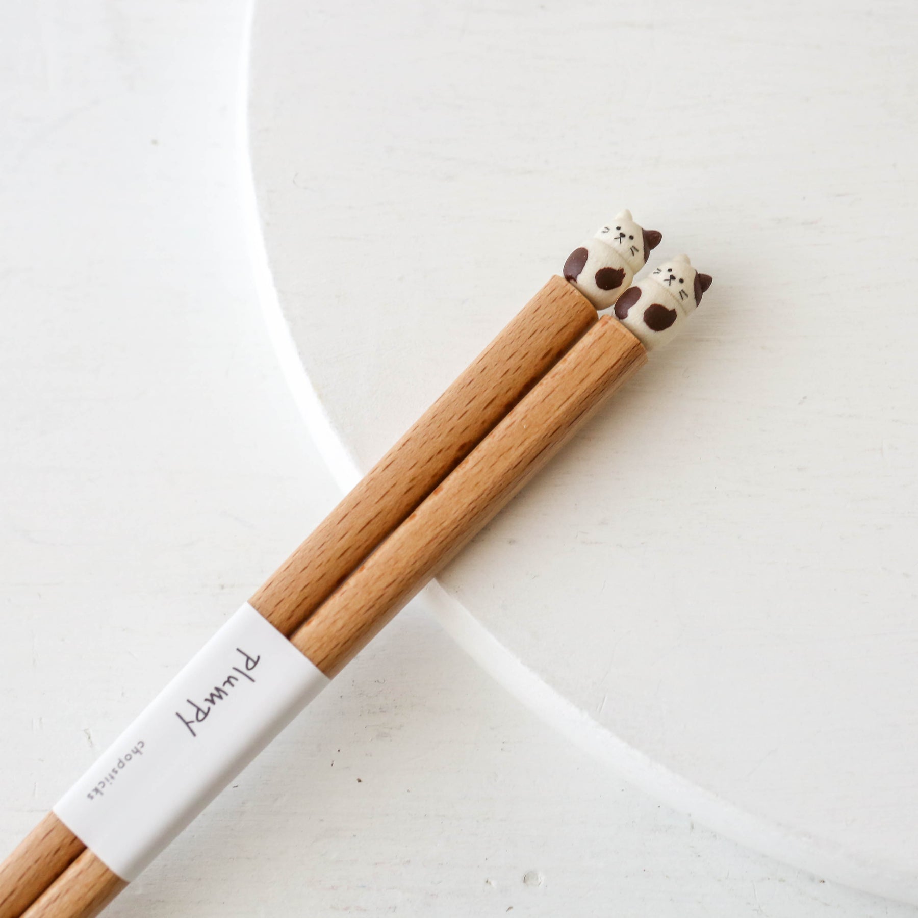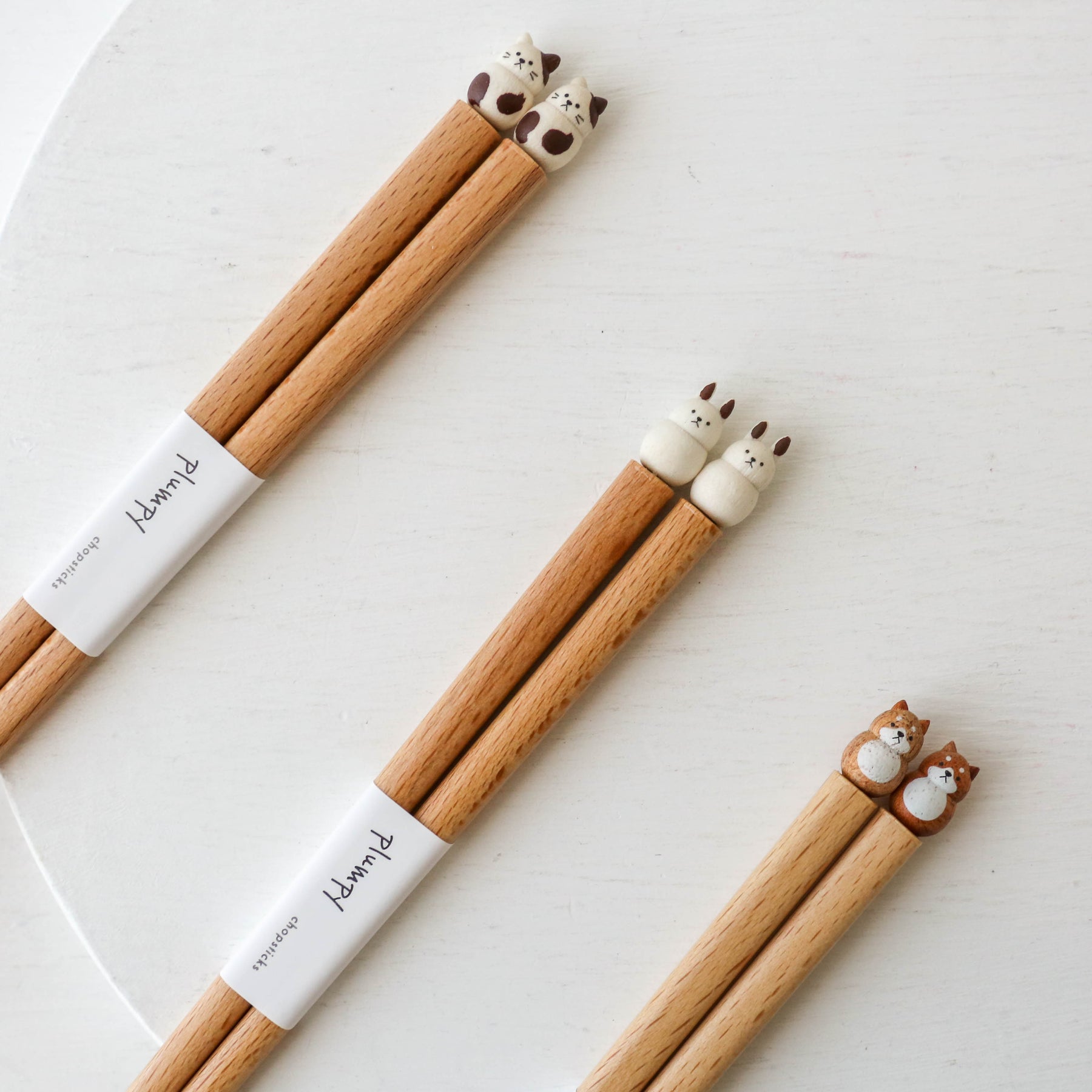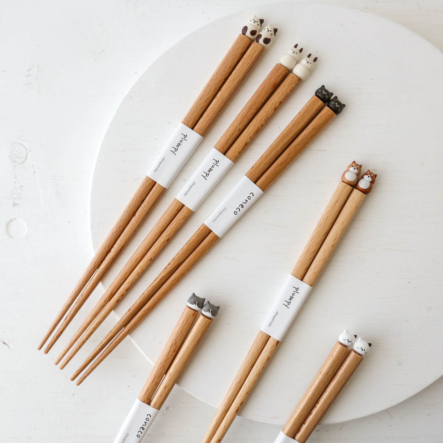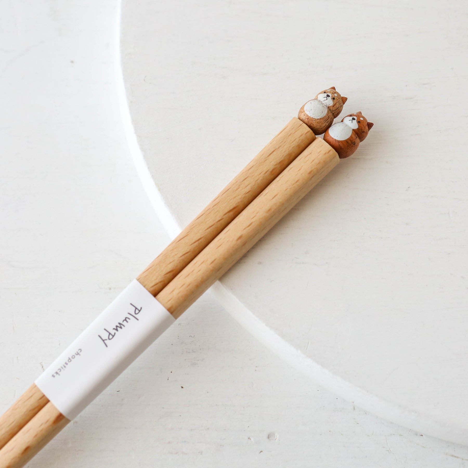 A single pair of adorable wooden chopsticks, topped with a pair of cute, hand painted plump animals, to keep you company whilst you eat.