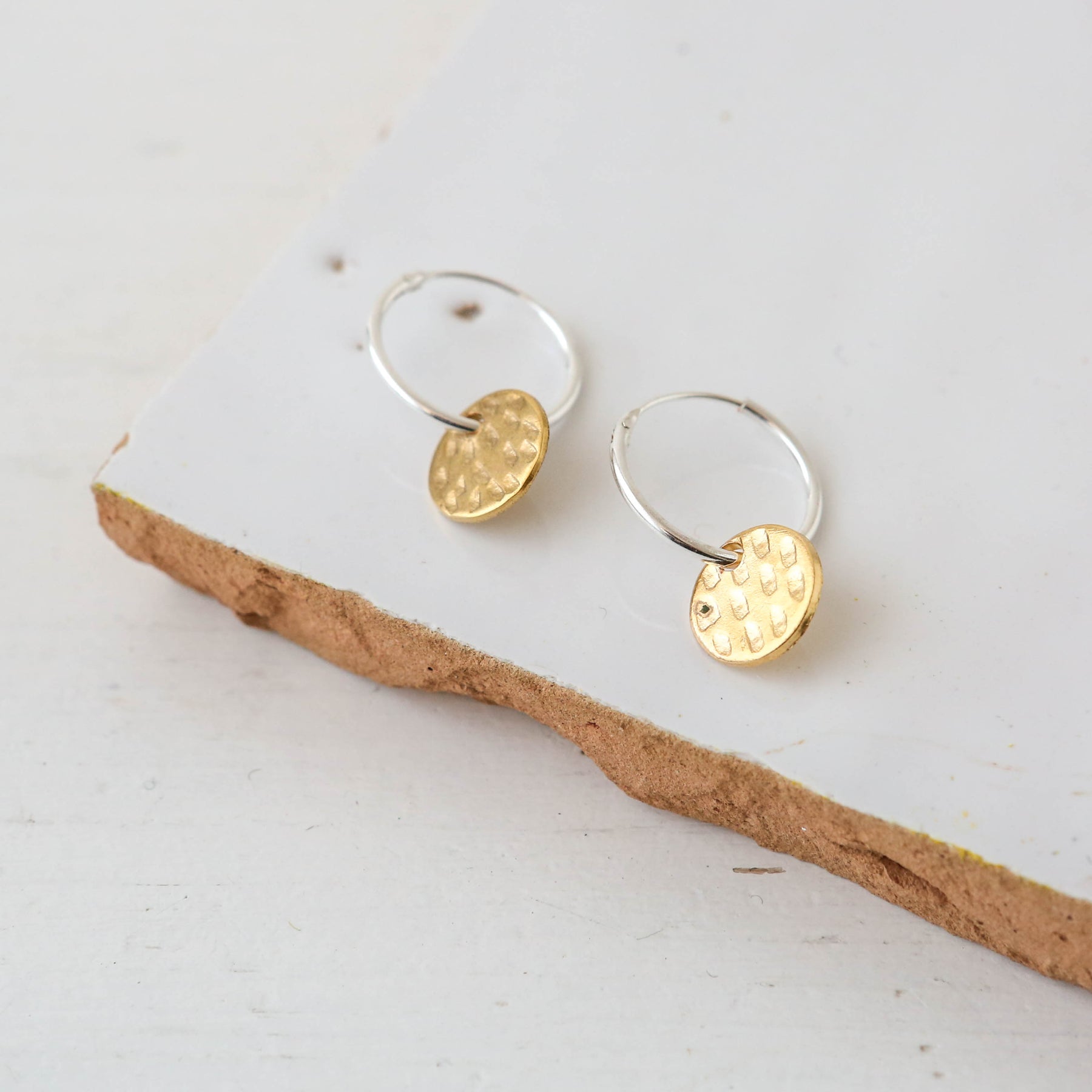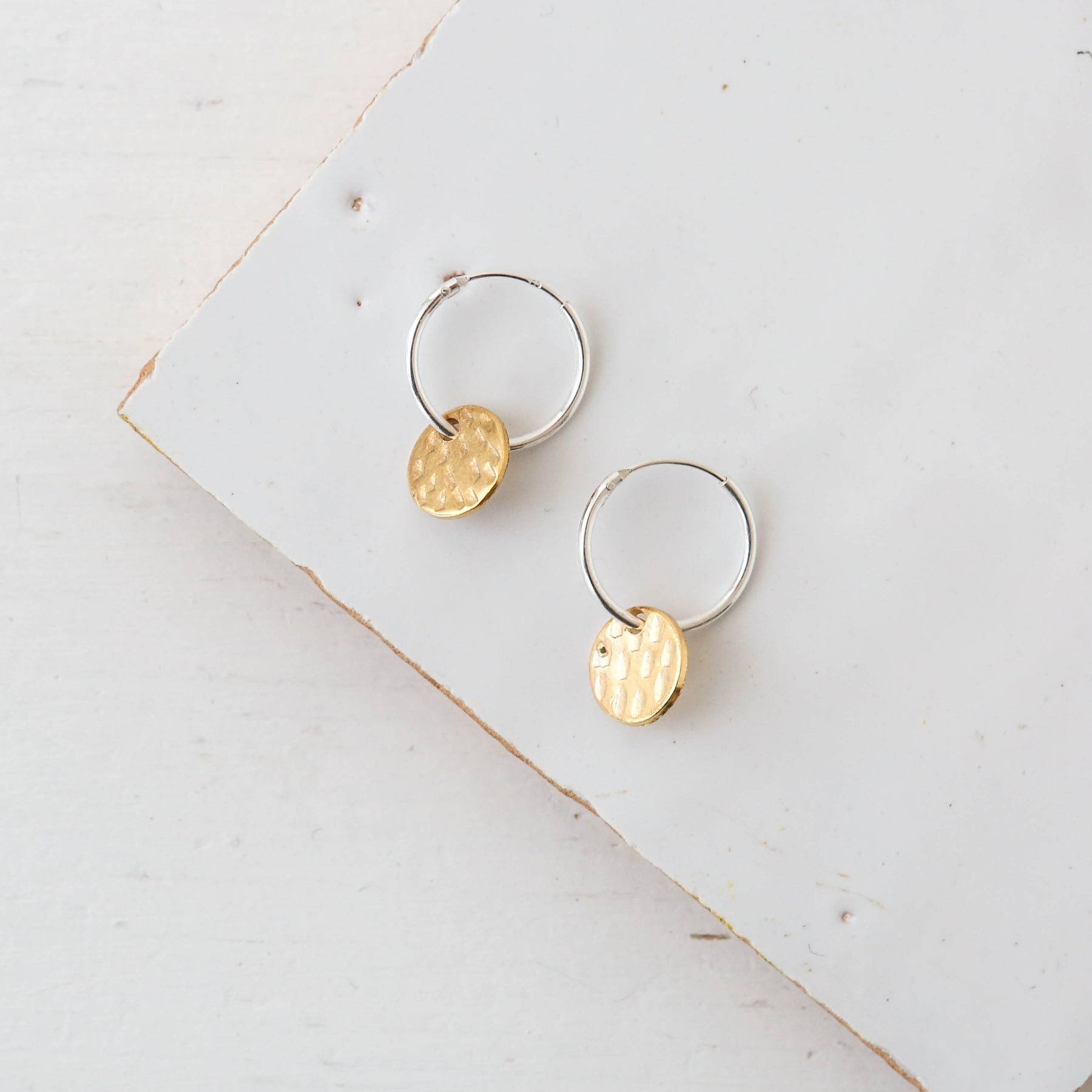 A simple, unhinged sterling silver sleeper earring with a brass hammered circle charm looped on. We loved this mixed-metal look.