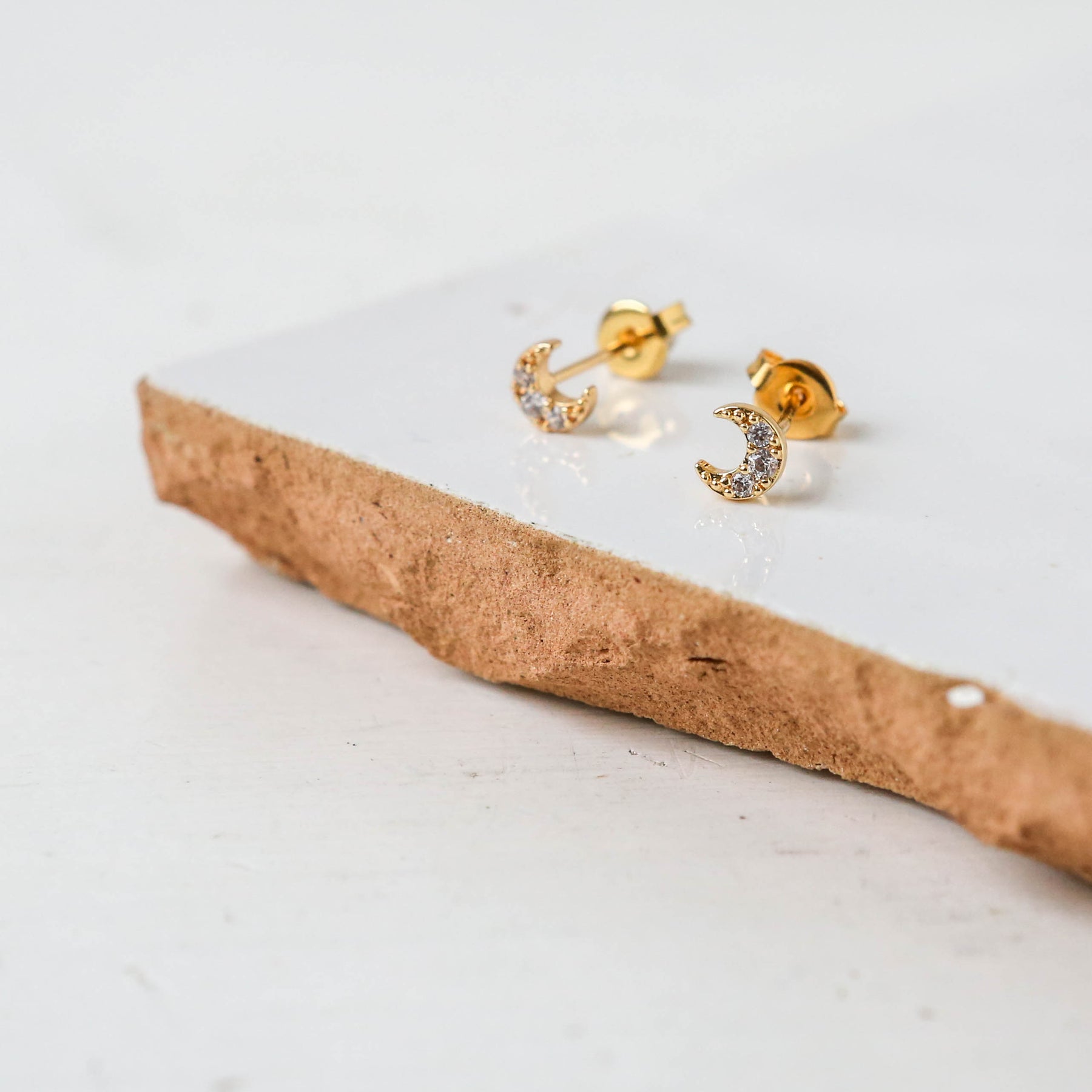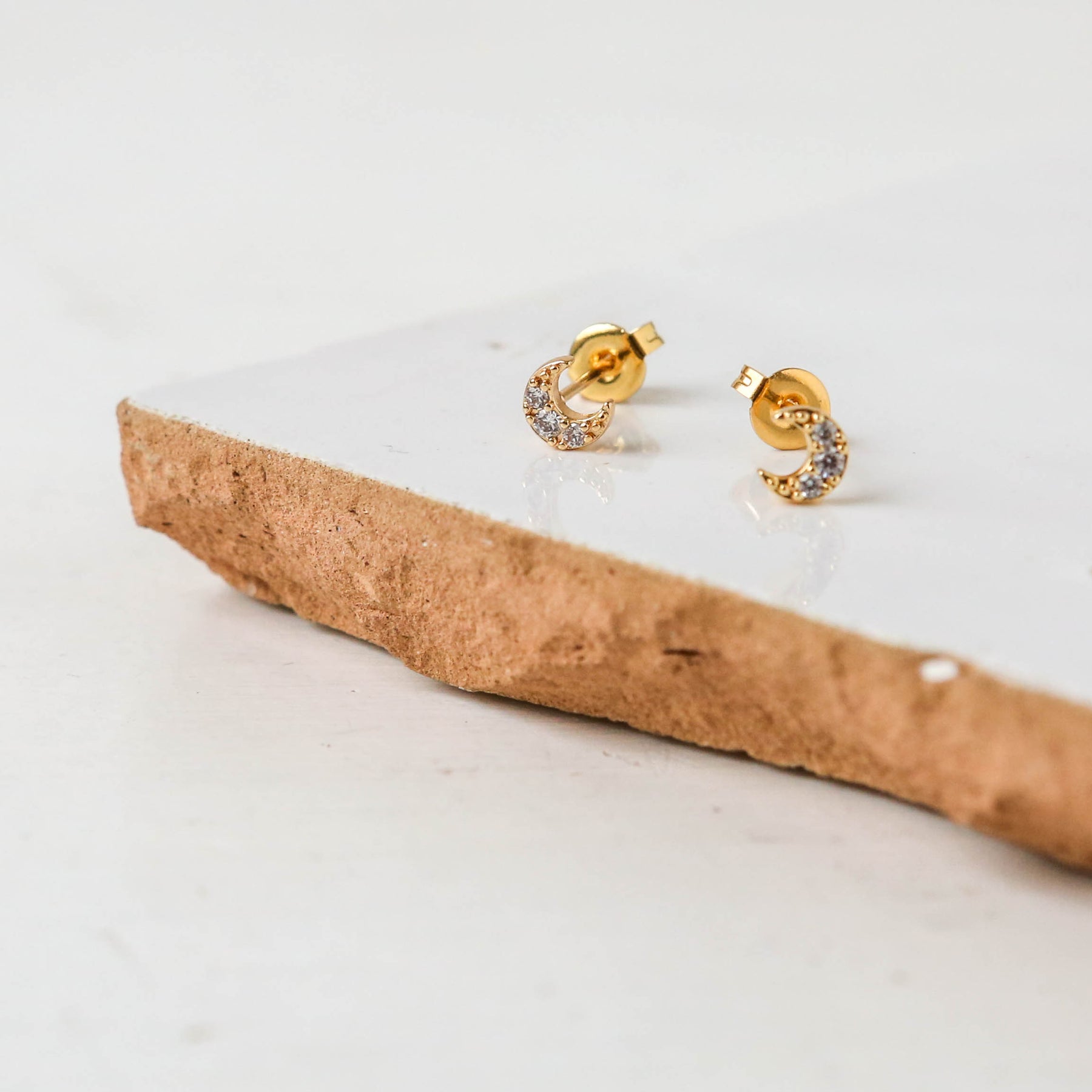 18k gold stud earrings with a cubic zirconia adorned crescent moons.