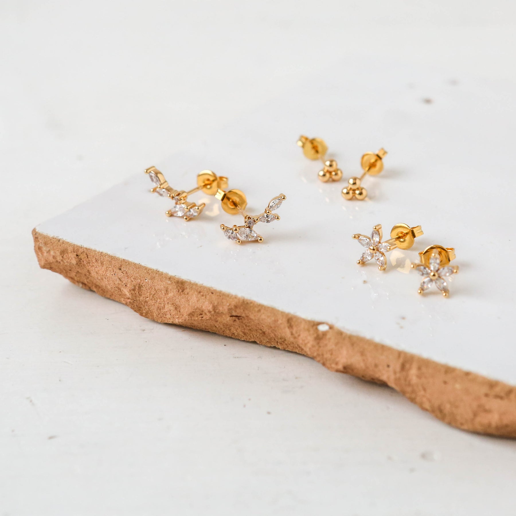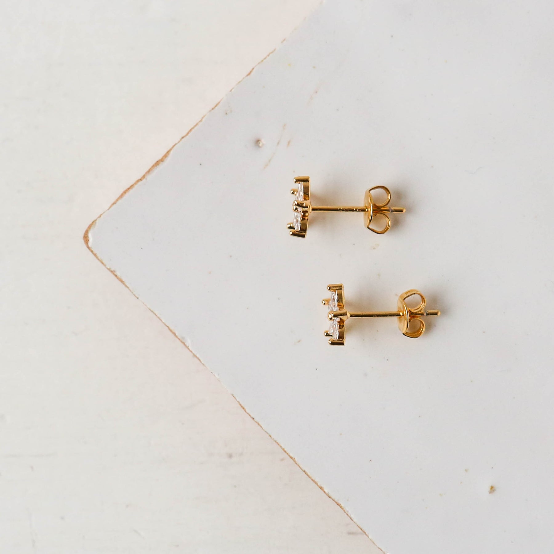 18k gold stud earrings with a cubic zirconia adorned flowers.