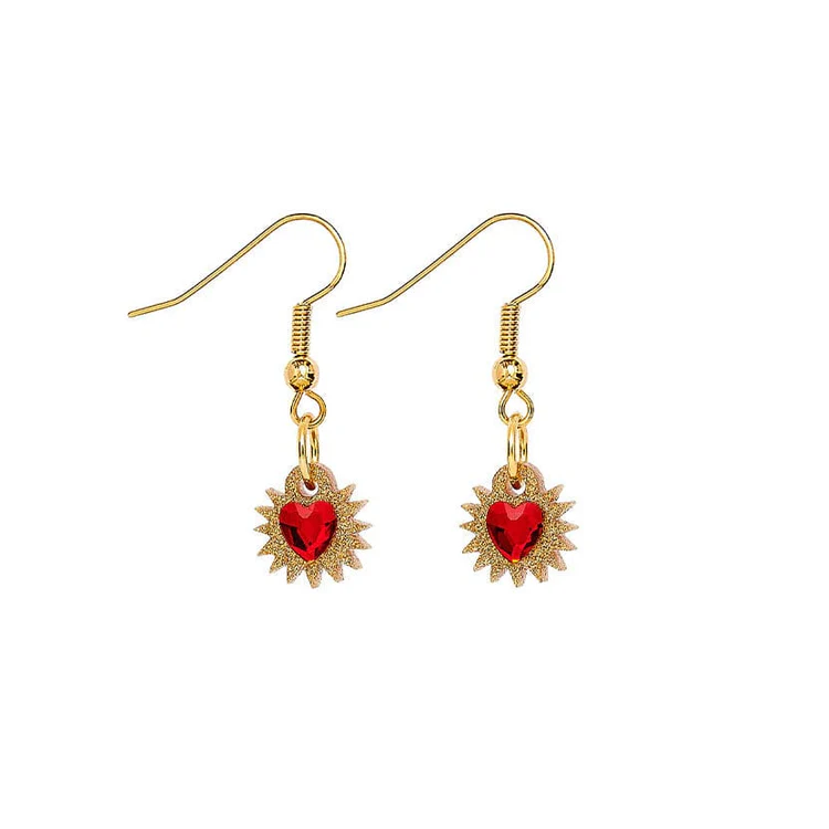 Subtle statement jewellery you’ll love: enter our Mini Immaculate Heart Earrings. Perfect for stacked piercing styling to dainty everyday looks, a pair of celestial blooms laser cut in fine gold glitter acrylic are topped with glistening heart-shaped red crystals. Suspended from hypoallergenic gold-plated hooks, pair with your go-to gold chains and matching Mini Immaculate Heart Pendant.