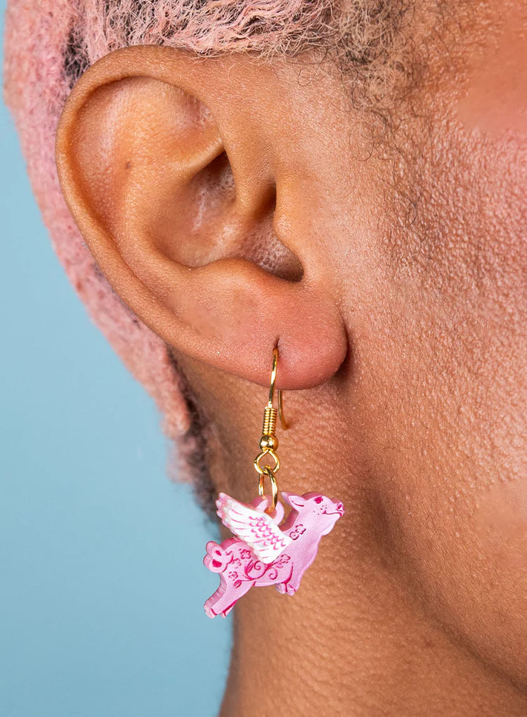 Making micro-pigs a must-have accessory: it’s our Pigs Might Fly Earrings. We’ve created a playful pair of piglets in laser-cut marble pink acrylic, hand-inked with floral details, that fly from delicate feathered wings. Add idioms to your everyday jewellery rotation with these miniature drop earrings.