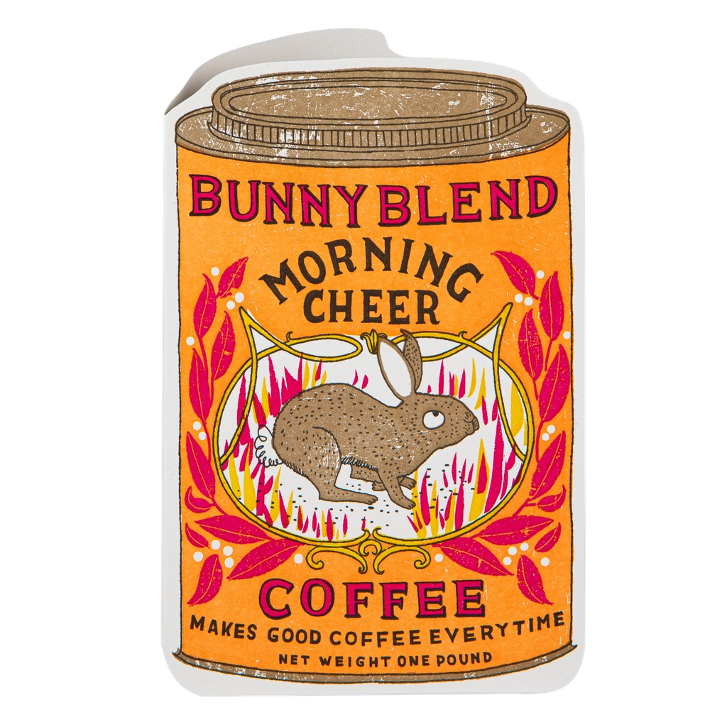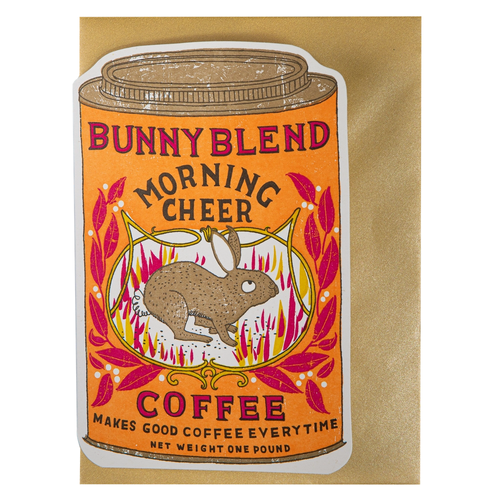 A letterpress cut-out card featuring an orange tin with a bunny on the front and the words 'Bunny Blend, Morning Cheer, Coffee.' Designed by Charlotte Farmer.