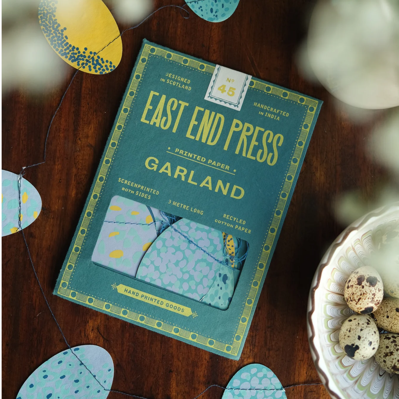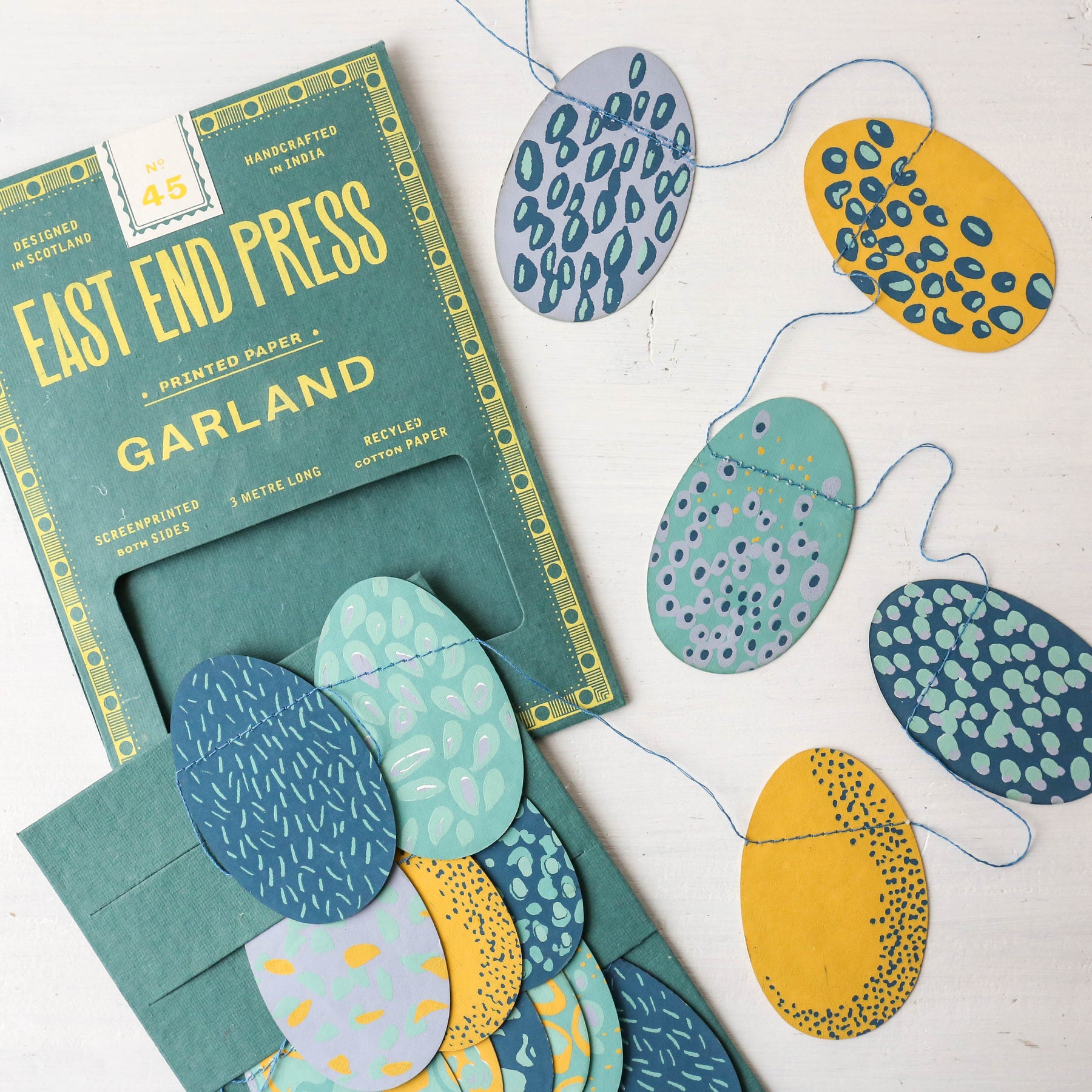 Created from varying shades of duck egg blue, turquoise, teal and ochre this garland is perfect for spring time decorating. Twenty little eggs are sewn along the three metre length.