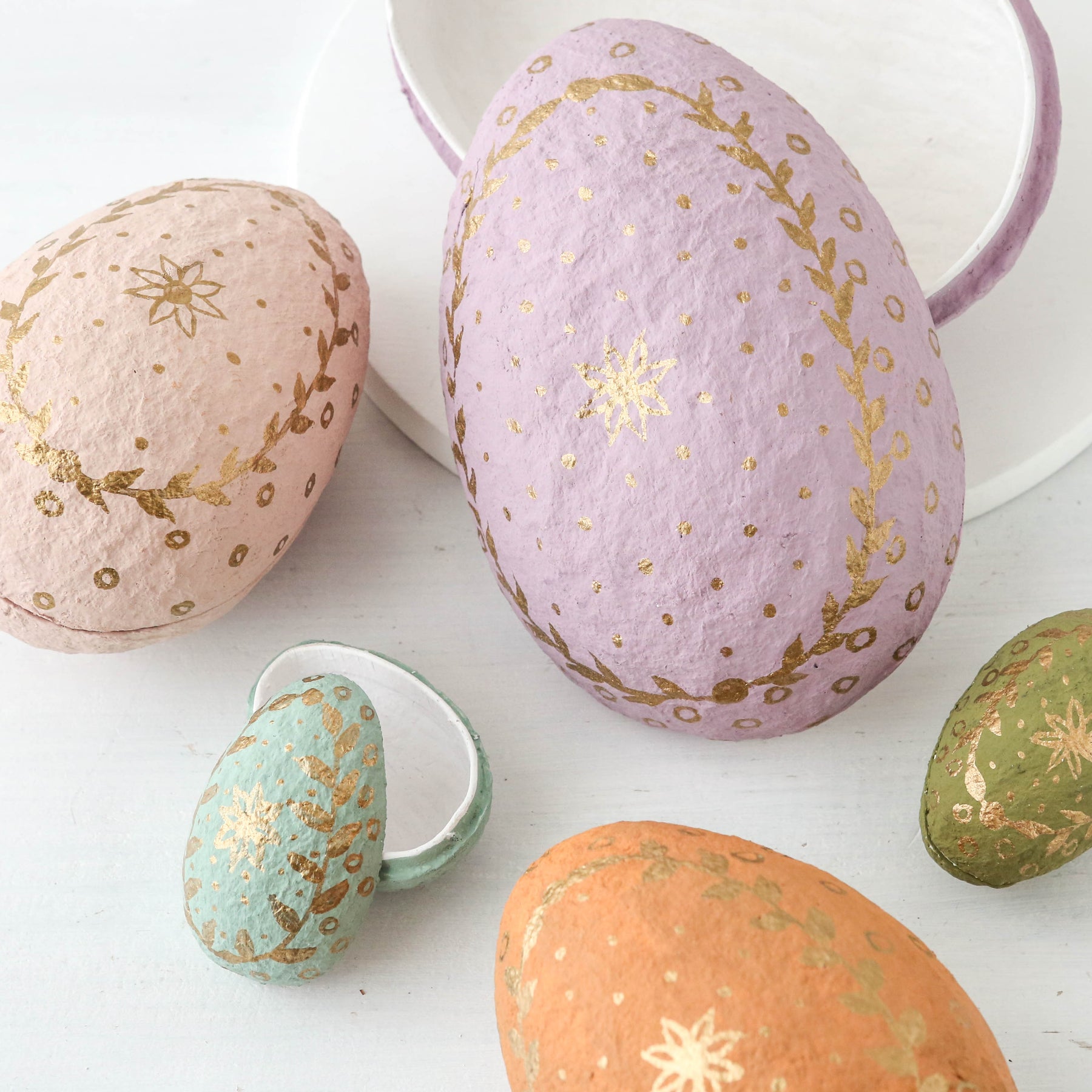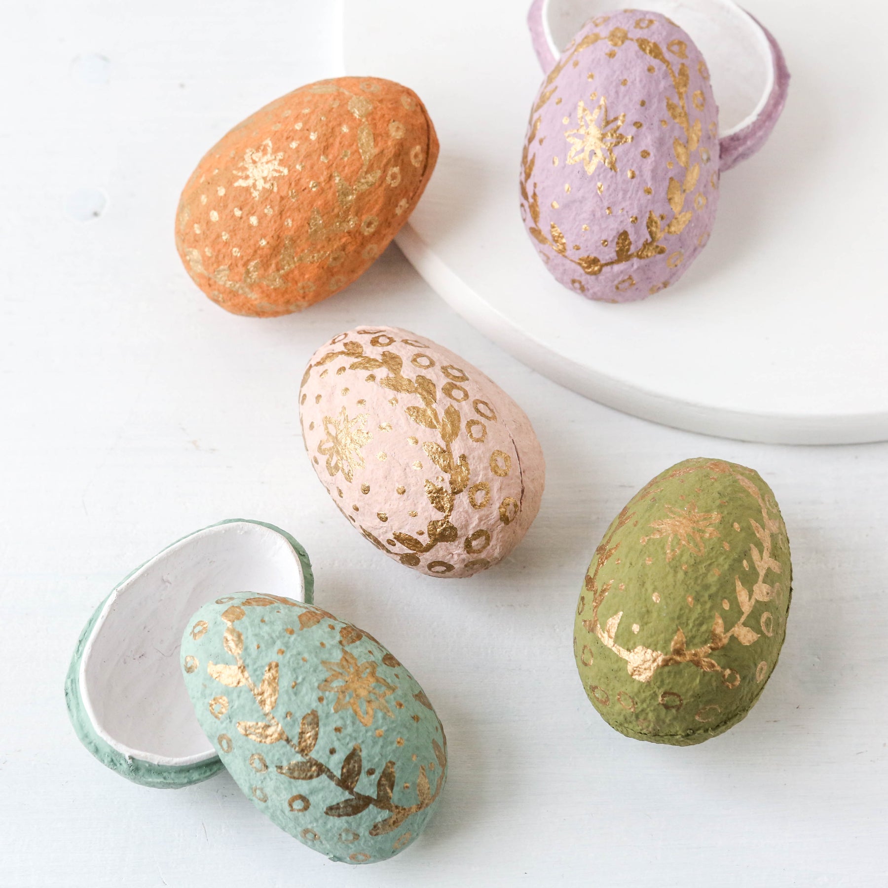 The beautiful Easter eggs divided into two are made from "katran", which is recycled cotton fabric scraps from the clothing industry. A cotton mache is made from the scraps to form the small figures - and lastly they are hand painted.