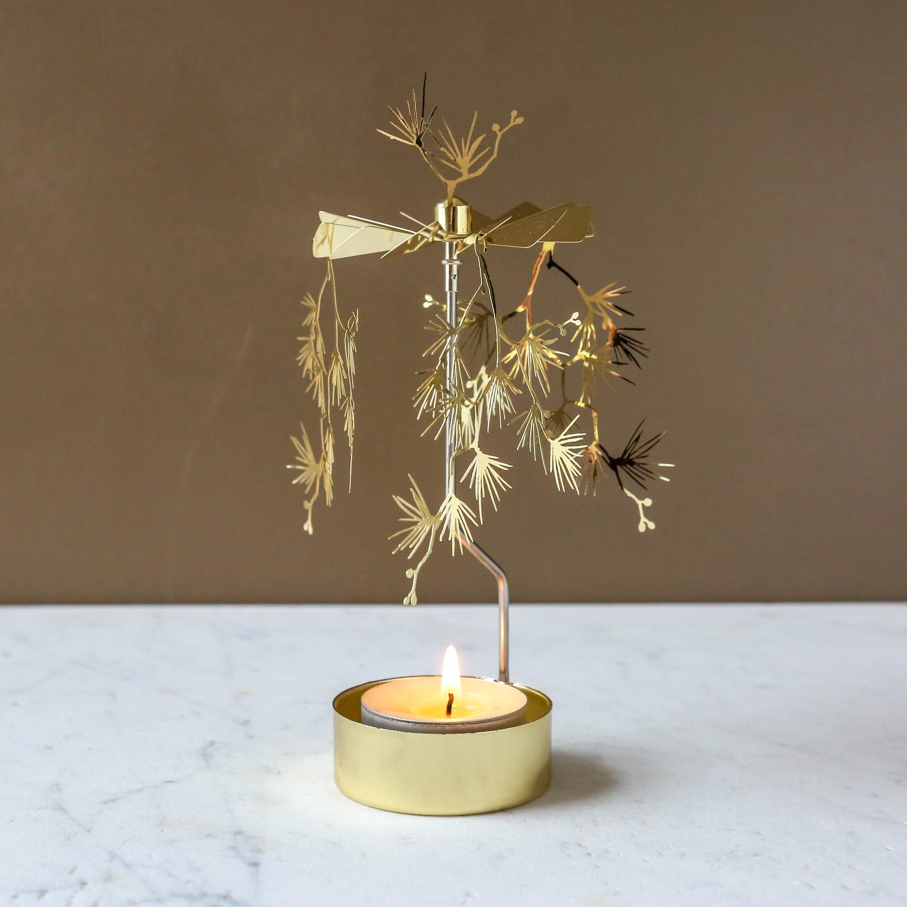 Watch as the warm air from a lit tea light causes the sails of this beautiful candle holder to spin. The shadows cast as they rotate are enchanting to observe.