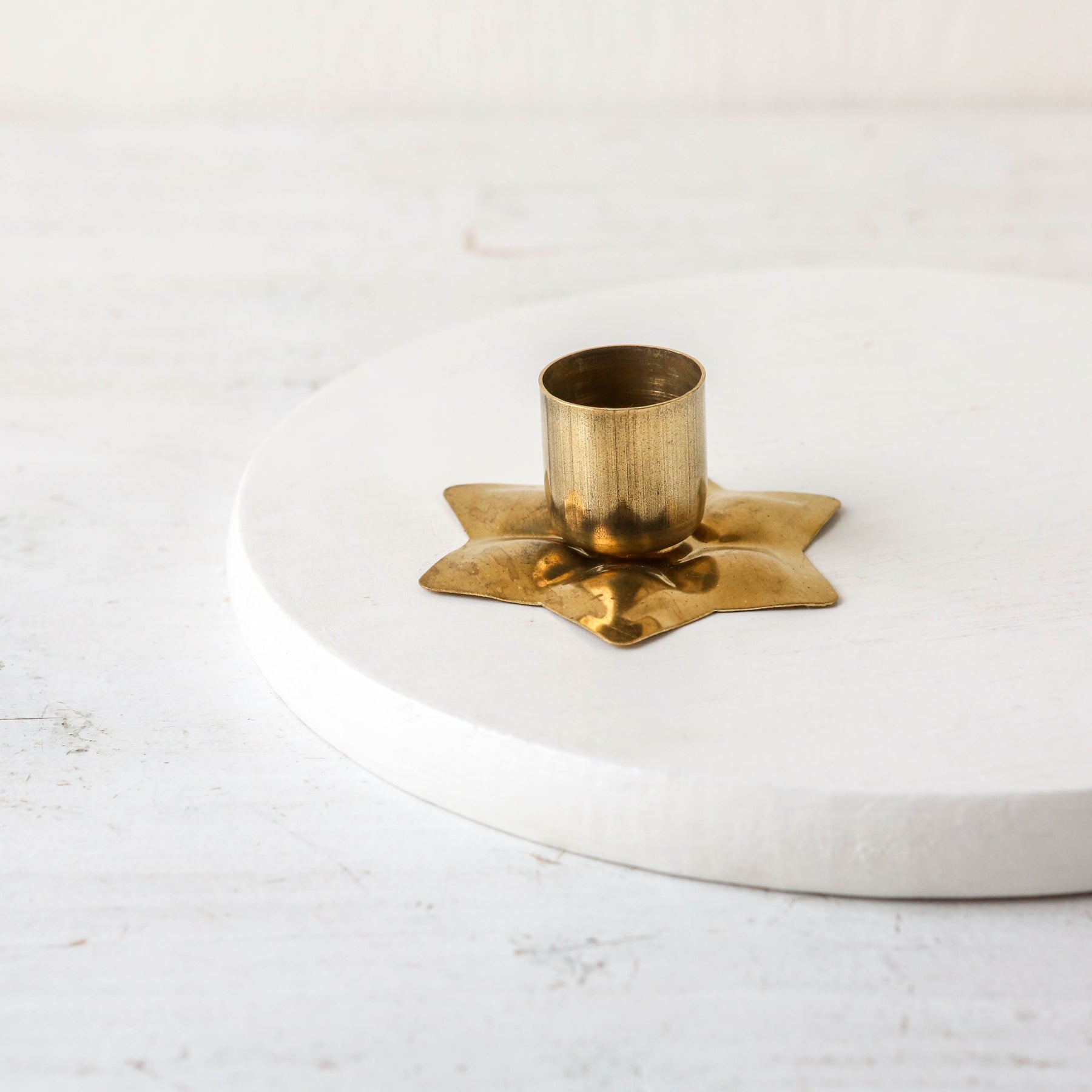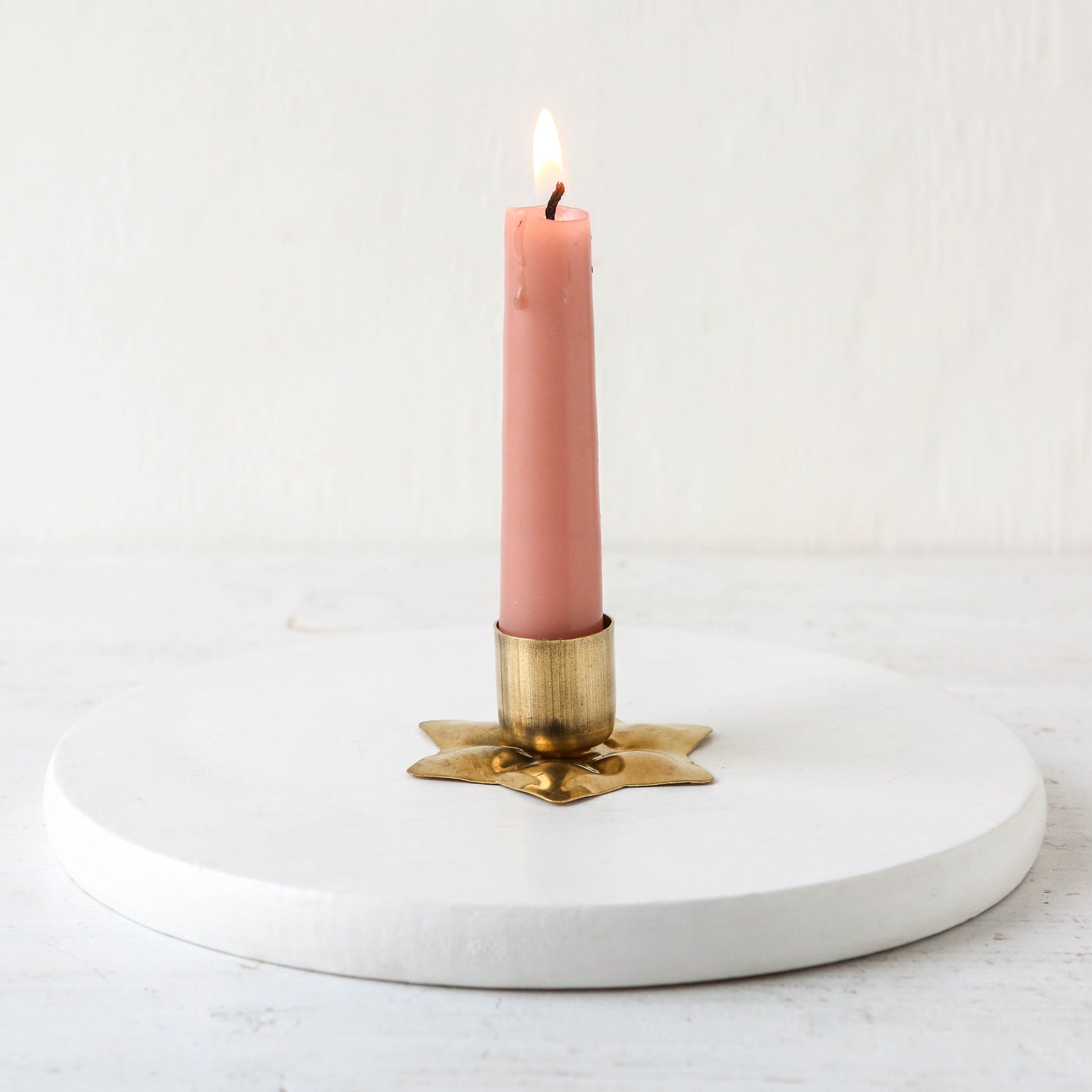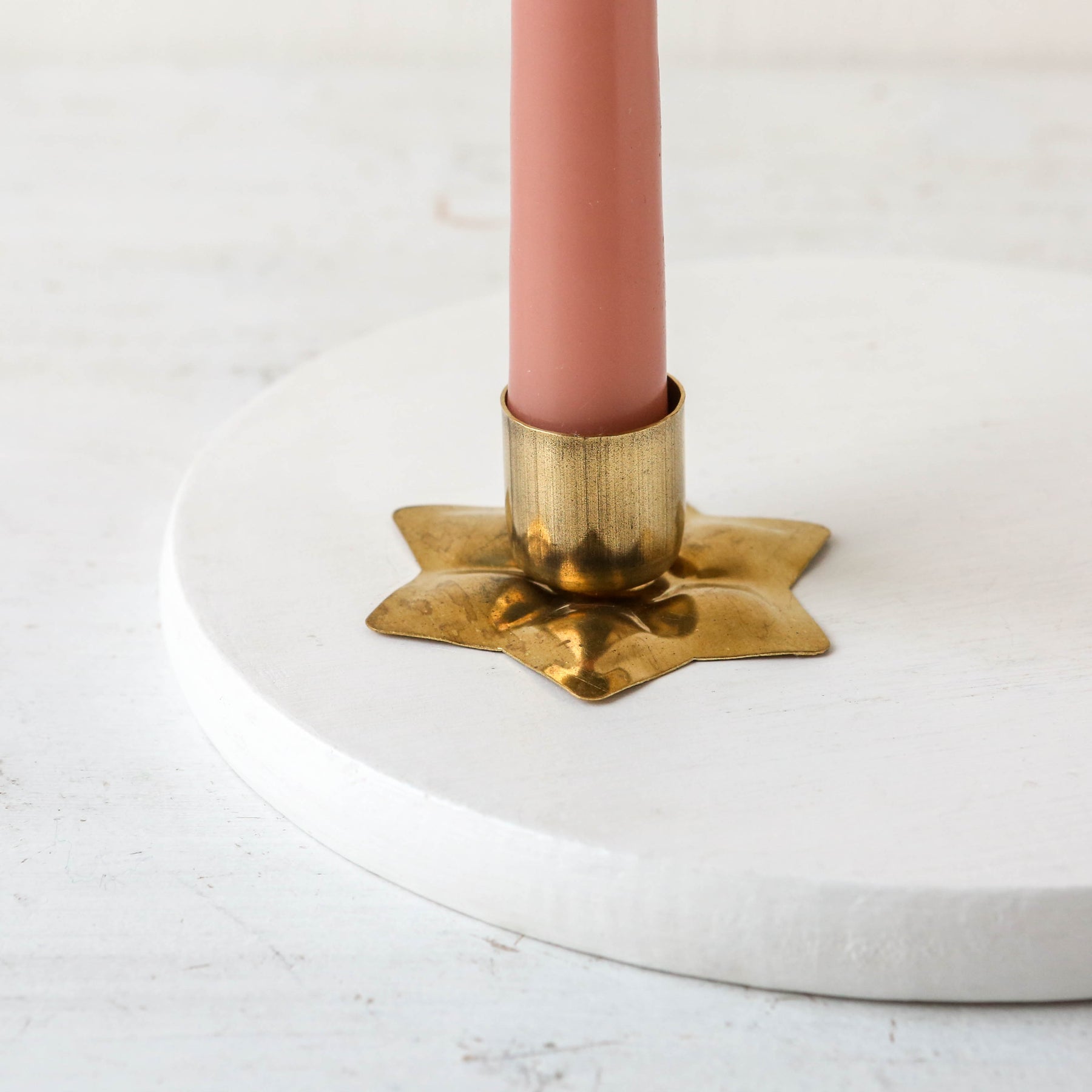 Simple star shaped brass dinner candle holder, that will tarnish and build up a natural patina with age and handling. Polish to a shiny finish if you prefer!
