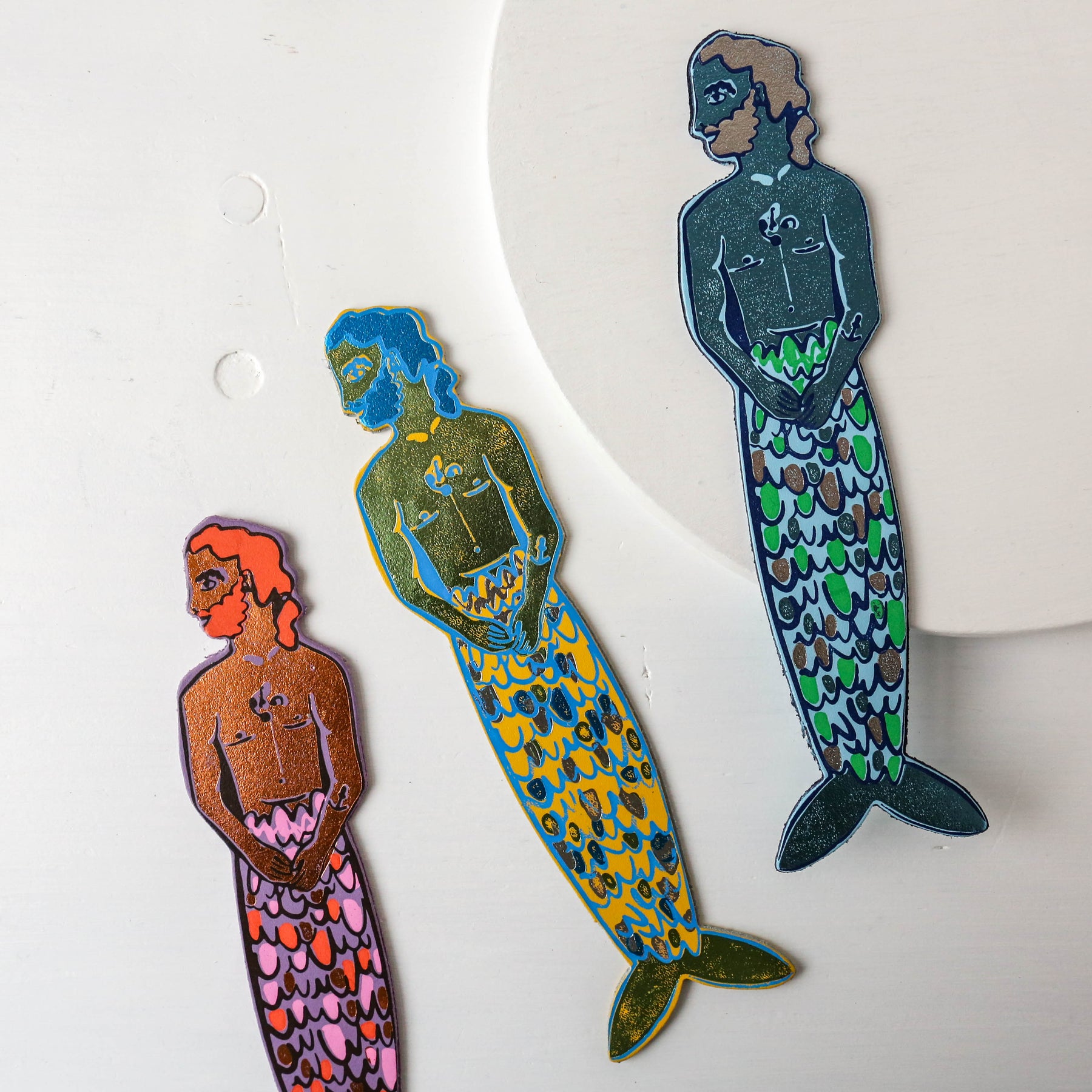 'Our new Mer-Man bookmark is making a splash! Each bookmark is carefully crafted to create a striking and multifaceted look that is sure to make a statement this summer. We have combined both shiny and matte foil in each design, creating depth and high impact. Our studio team hand emboss each product individually. Due to the handmade nature of the bookmark, each one is unique to the next.'