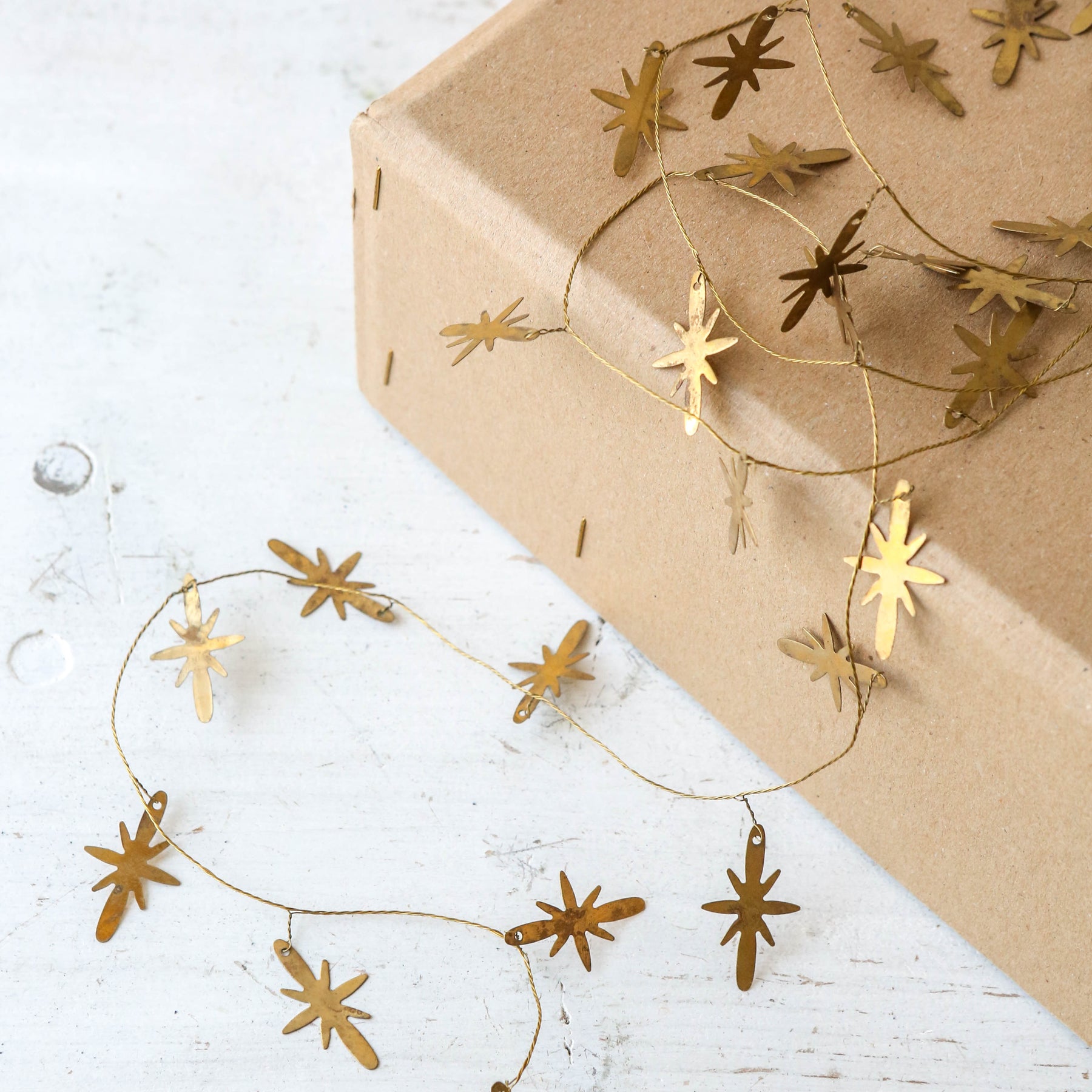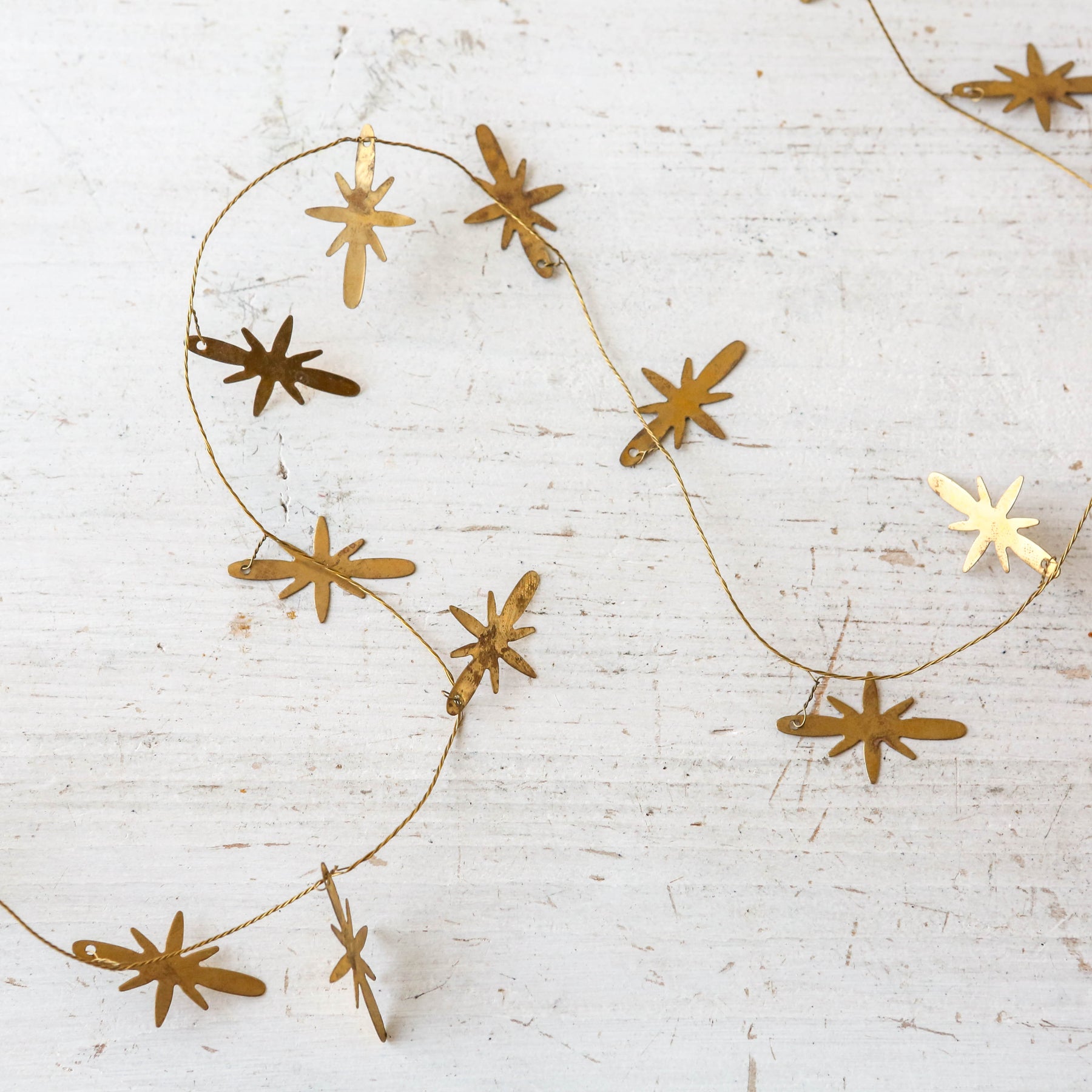 A beautiful brass finish garland. The delicate golden stars are strung prettily along a wire string, making it both durable and malleable. Could be used on its own for a classy minimal look, or wound amongst fresh winter greenery for an added hint of sparkle.