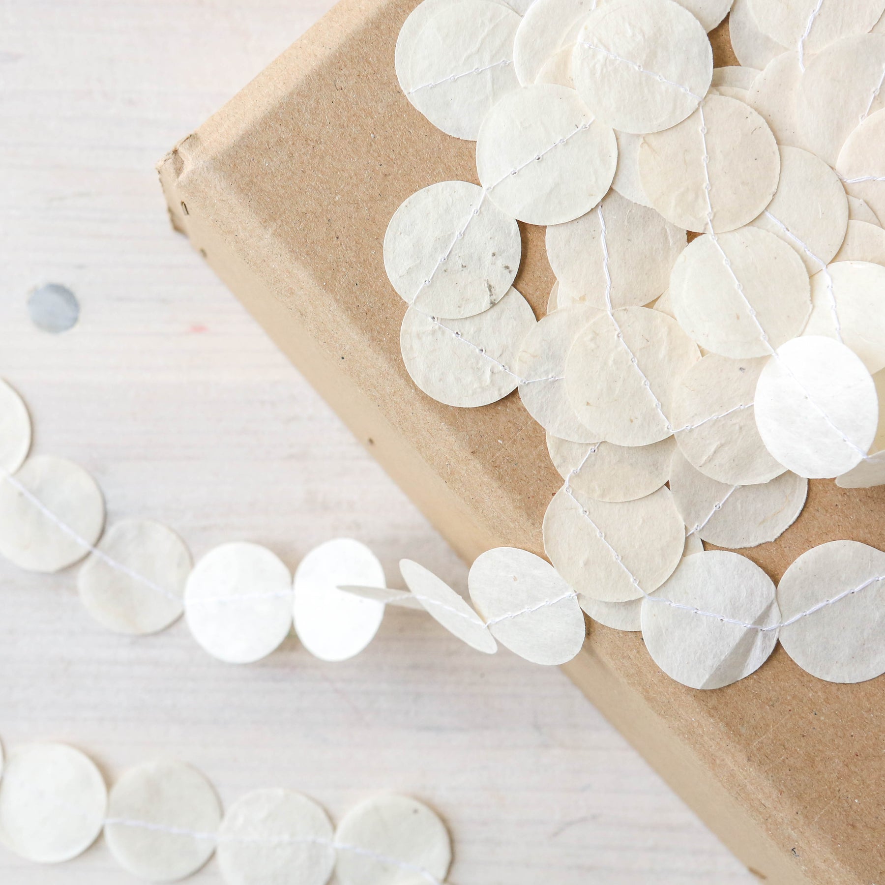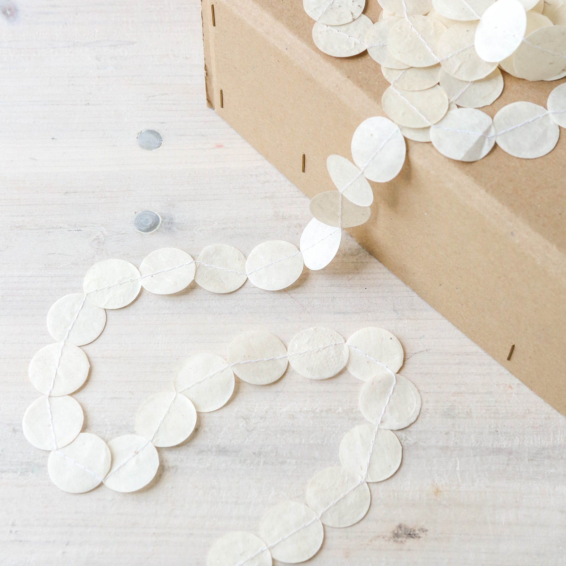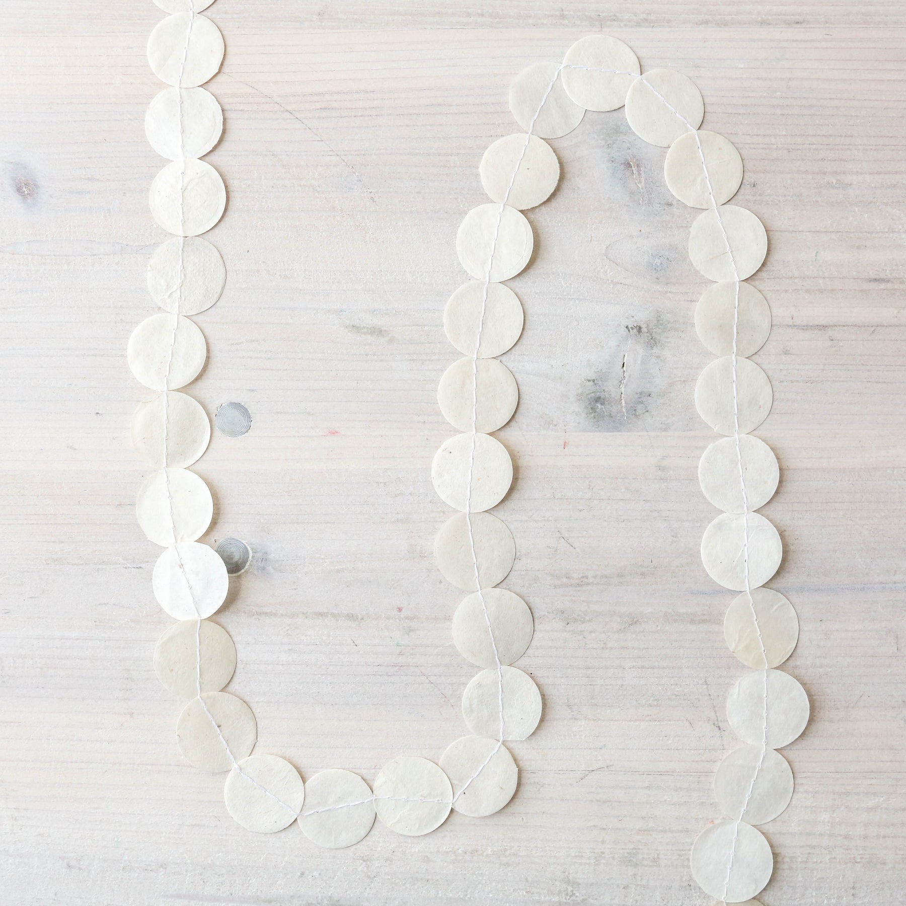 A hanging paper garland made from stitched together paper circles.