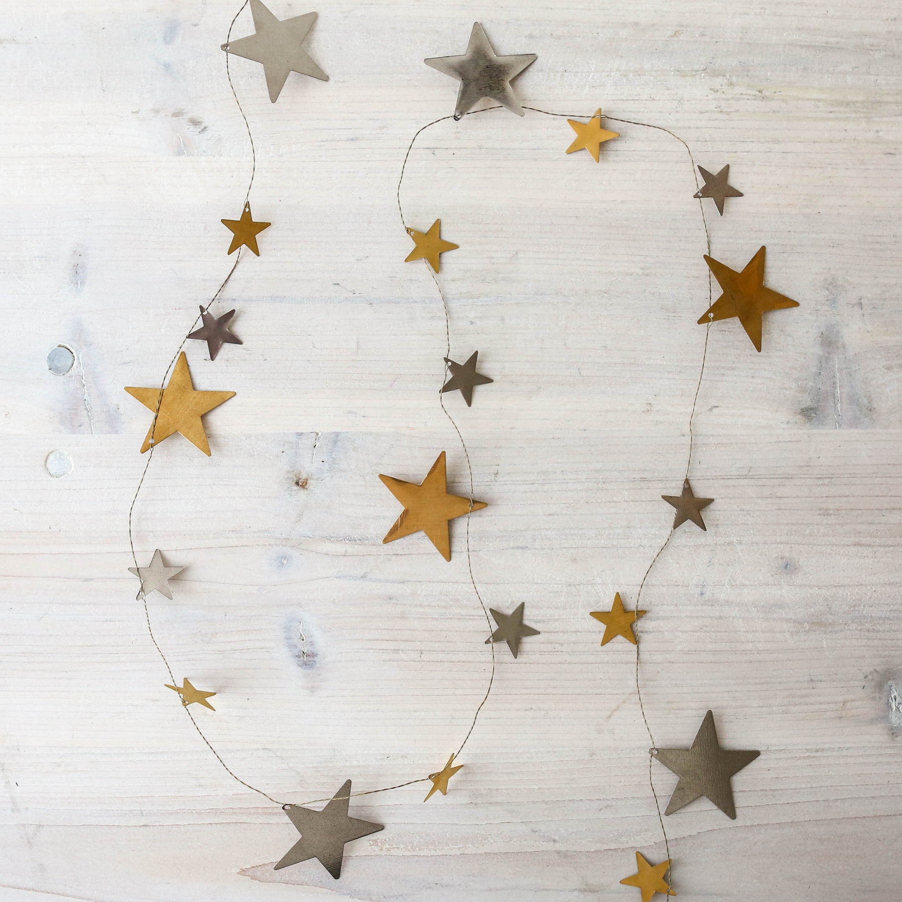 Delicate & shiny gold and silver stars are strung prettily along a twisted wire garland. Looks great nestled within greenery.