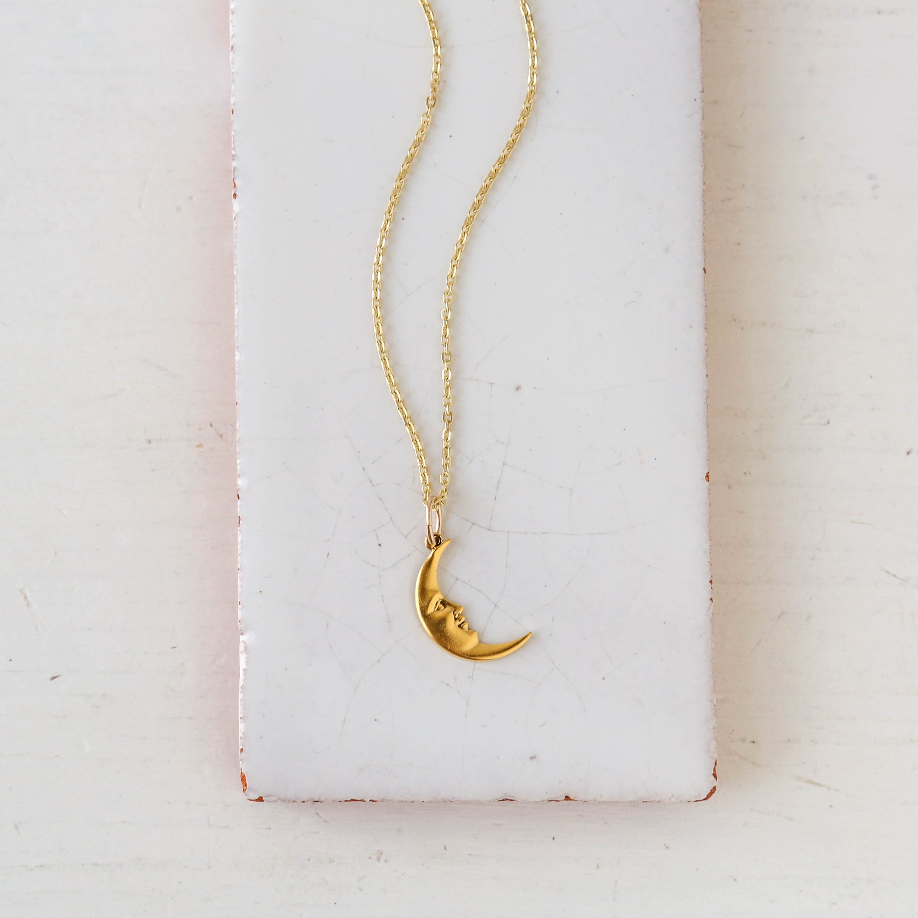 Gold plated man in the moon charm, hung on an 18ct gold plated silver chain.