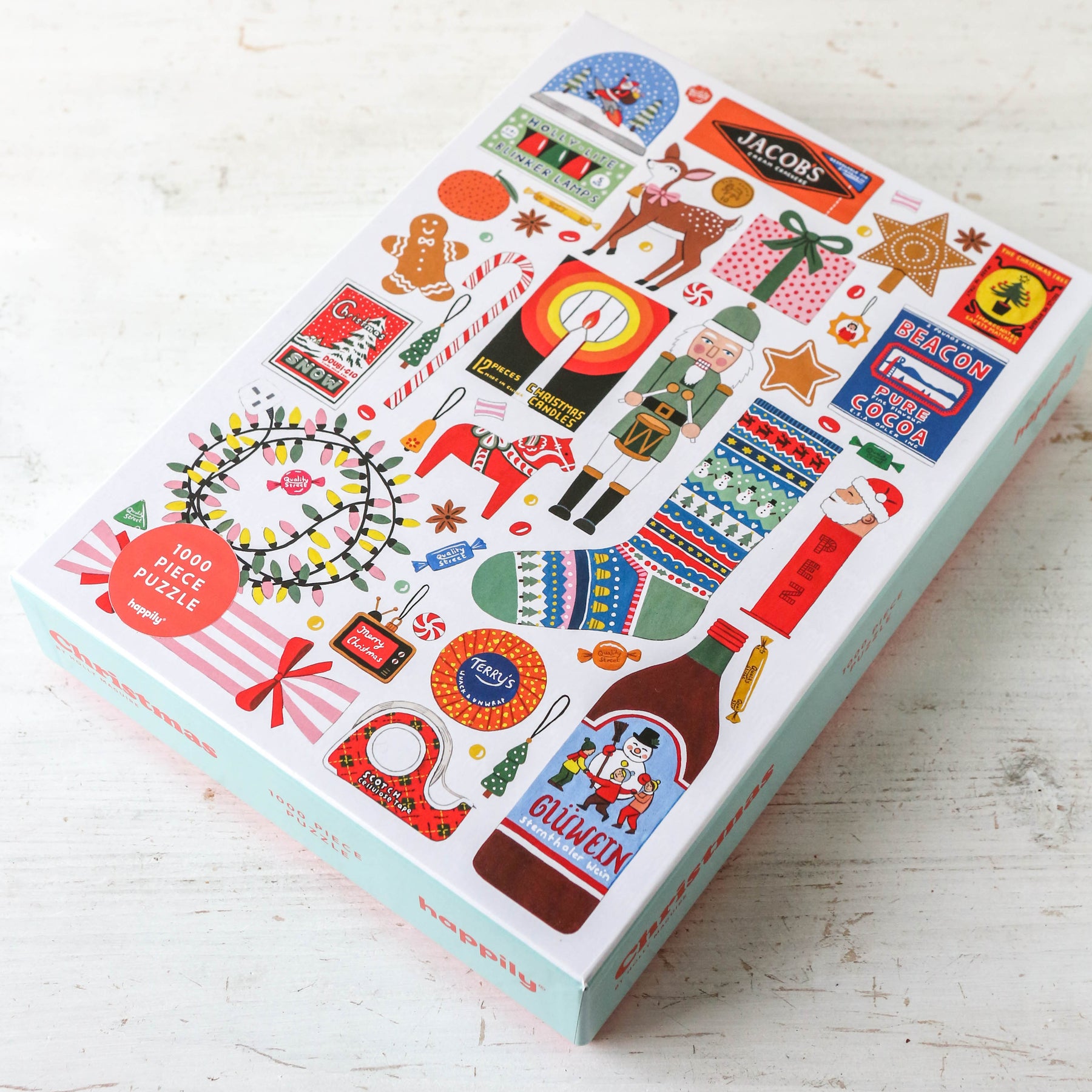 1,000 piece puzzle featuring a fun illustration of Festive nostalgia by Holly Maguire. The perfect family Christmas jigsaw puzzle.