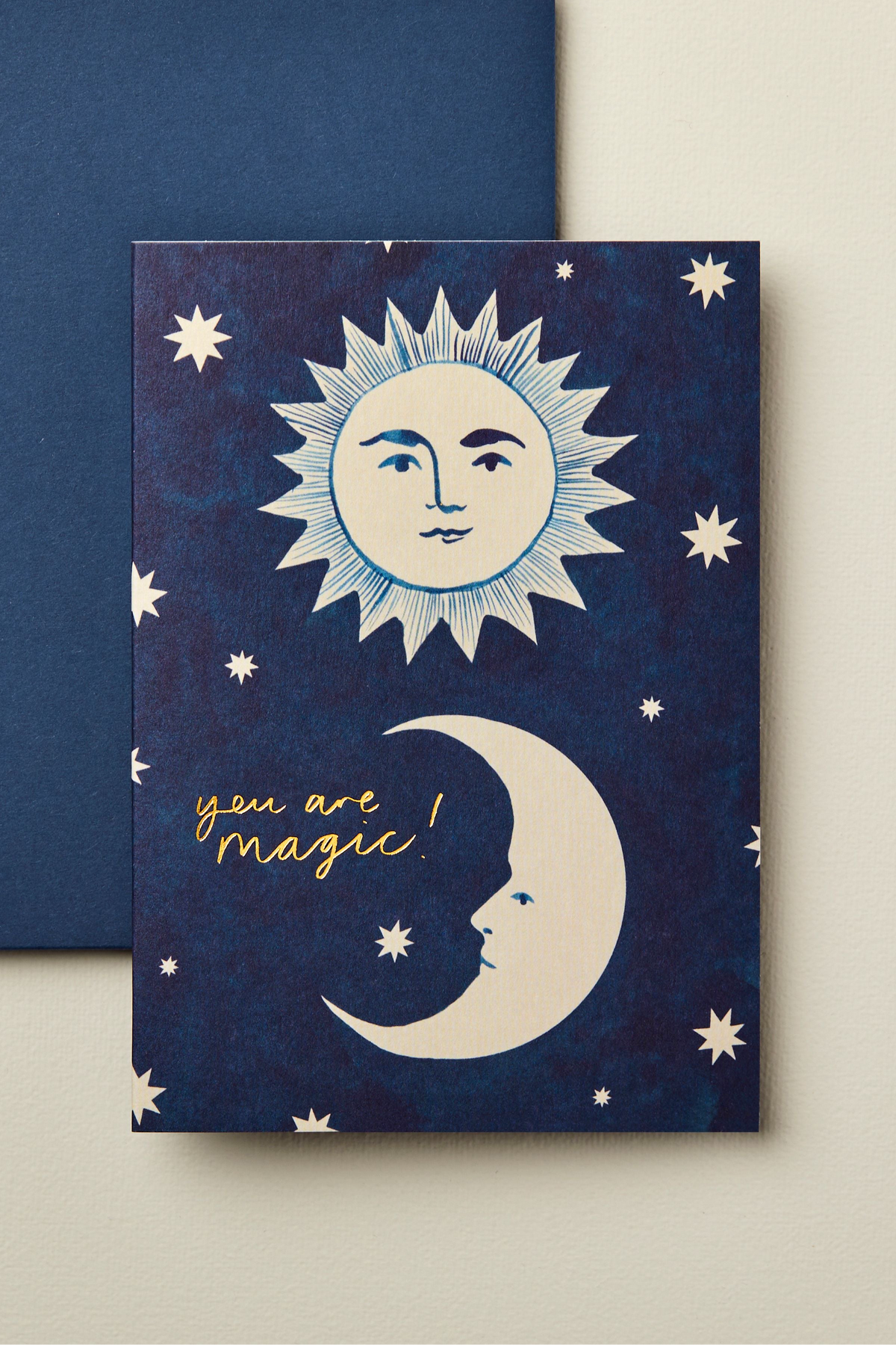 A deep indigo card with a painted moon and sun, and gold foil 'you are magic'. This card is paired with a blue envelope. Paired with a luxury cream envelope.