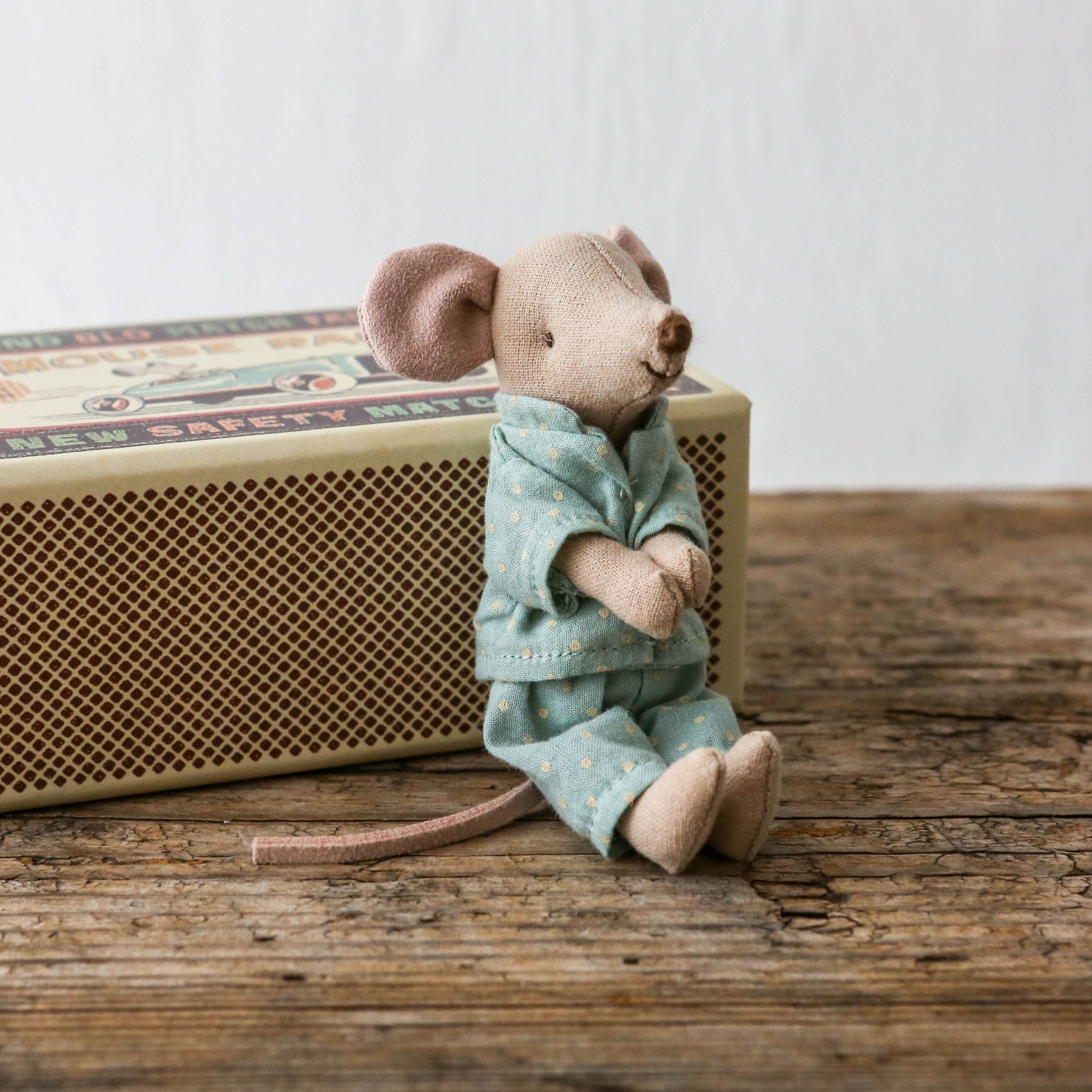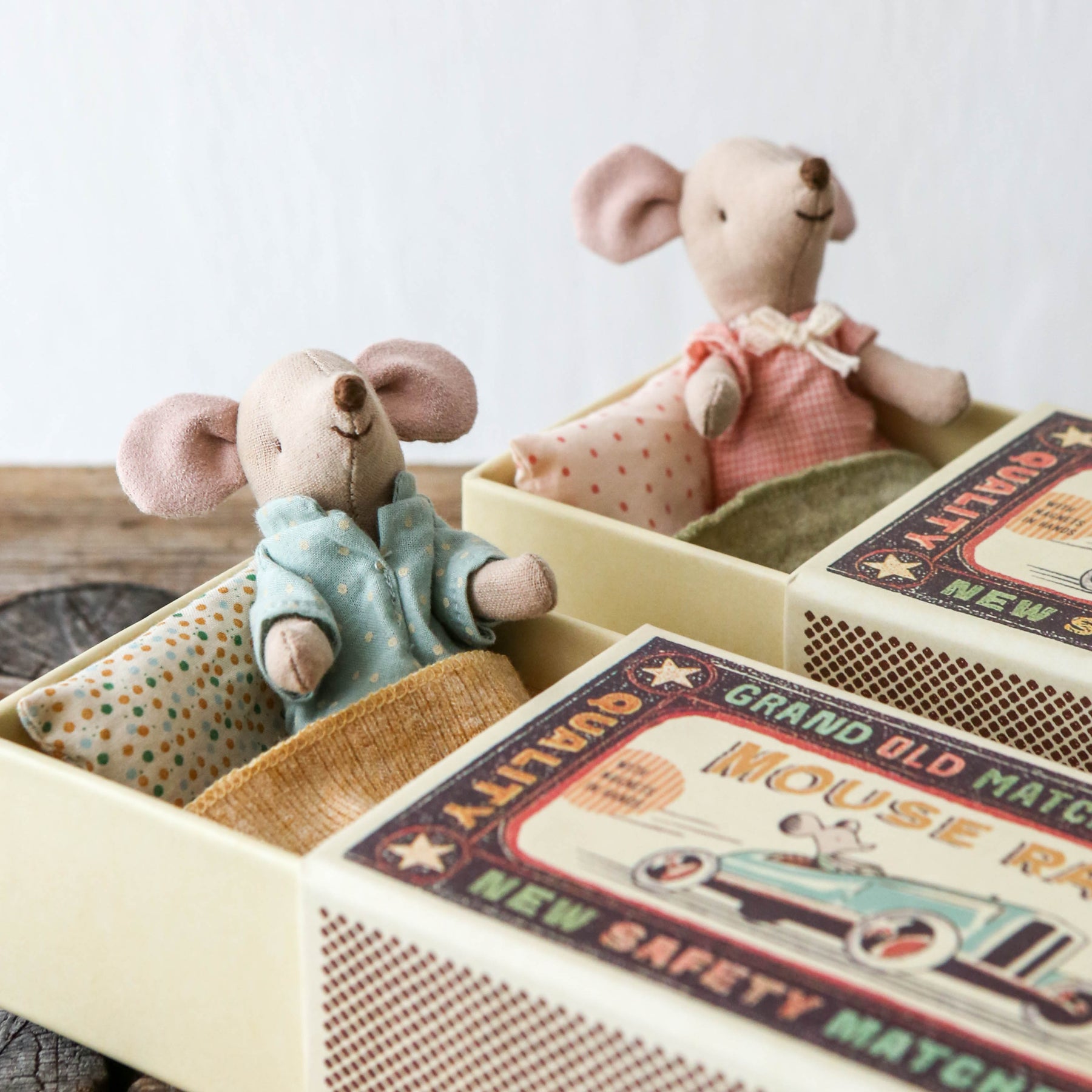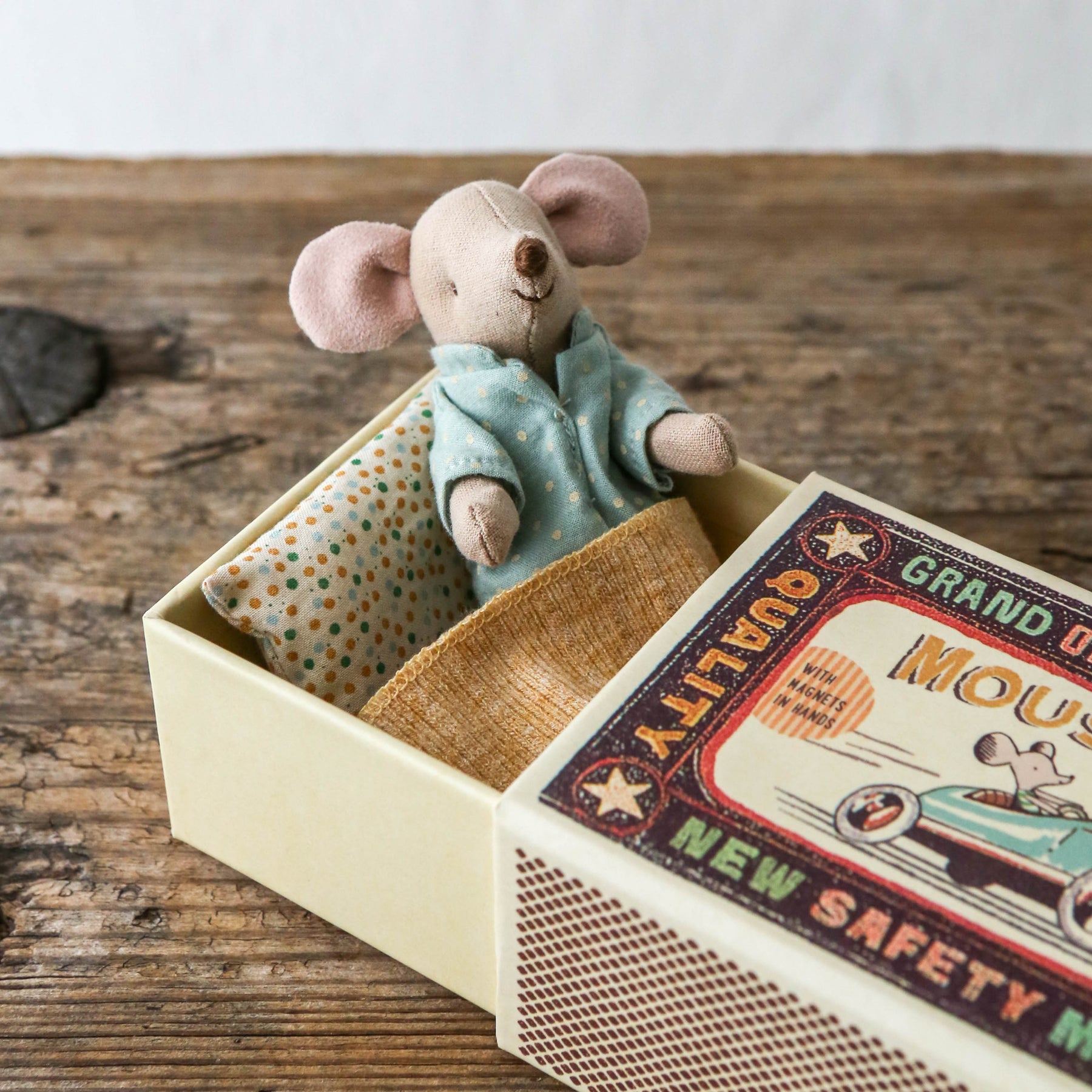 A classic Maileg item, this mouse is ready for hours of play and sleeps soundly in its little matchbox. The clothes and bedding are made of soft fabrics with unique prints in beautiful colours. The mouse has magnets in its hands.