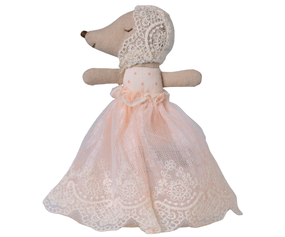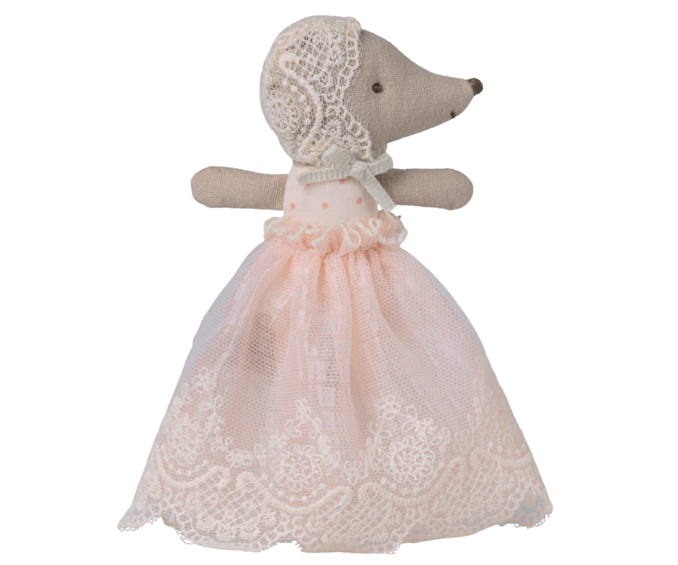 This baby mouse is dressed up for a day of celebration with a lovely dress and small bonnet full of beautiful details.