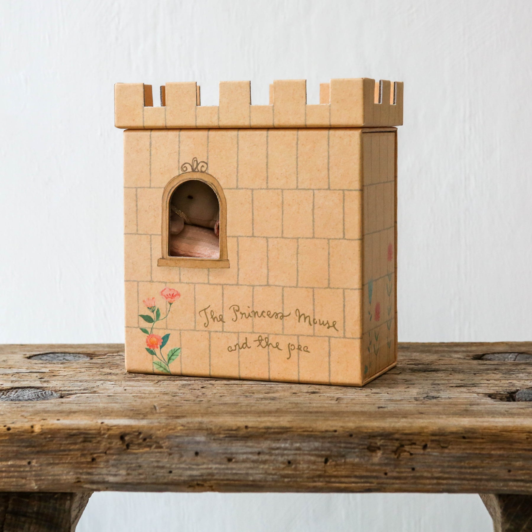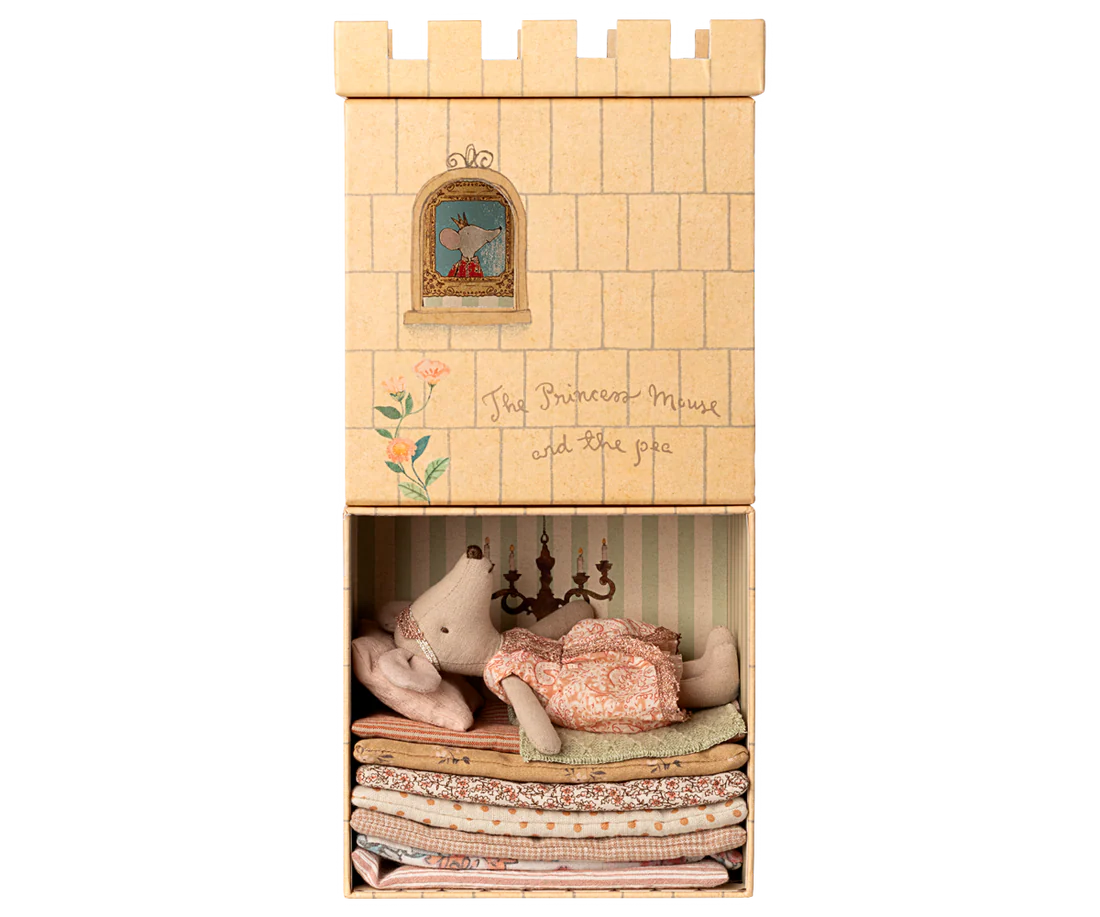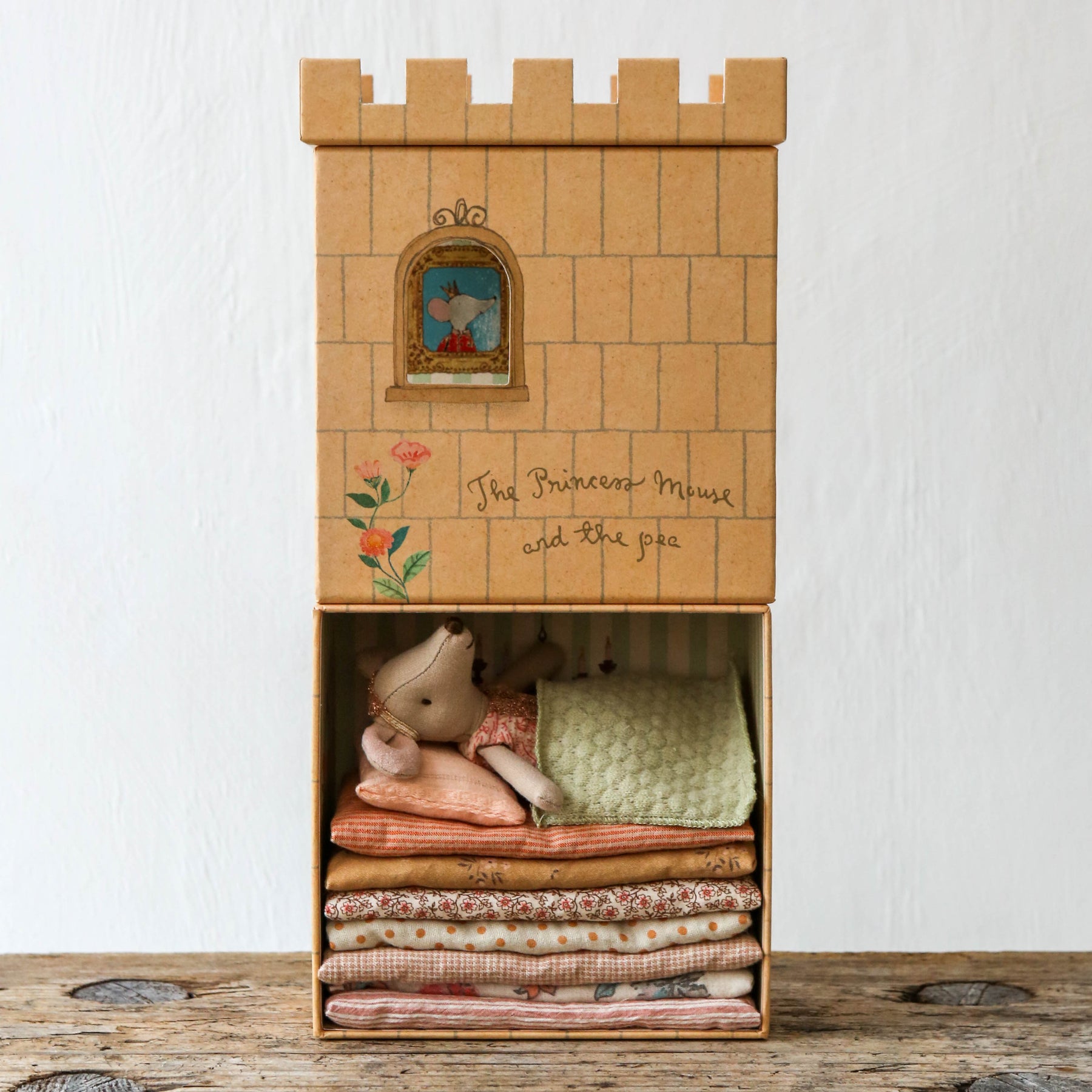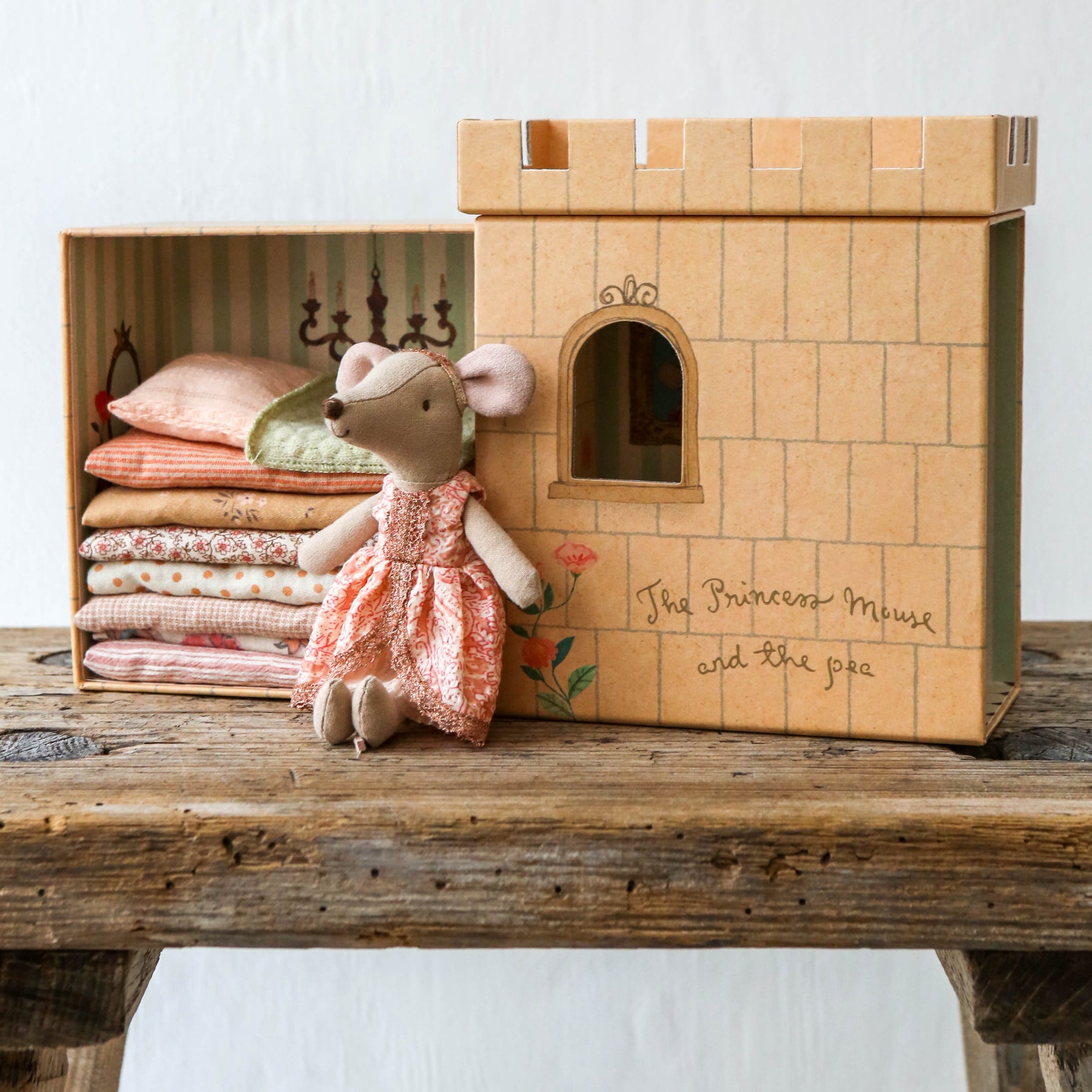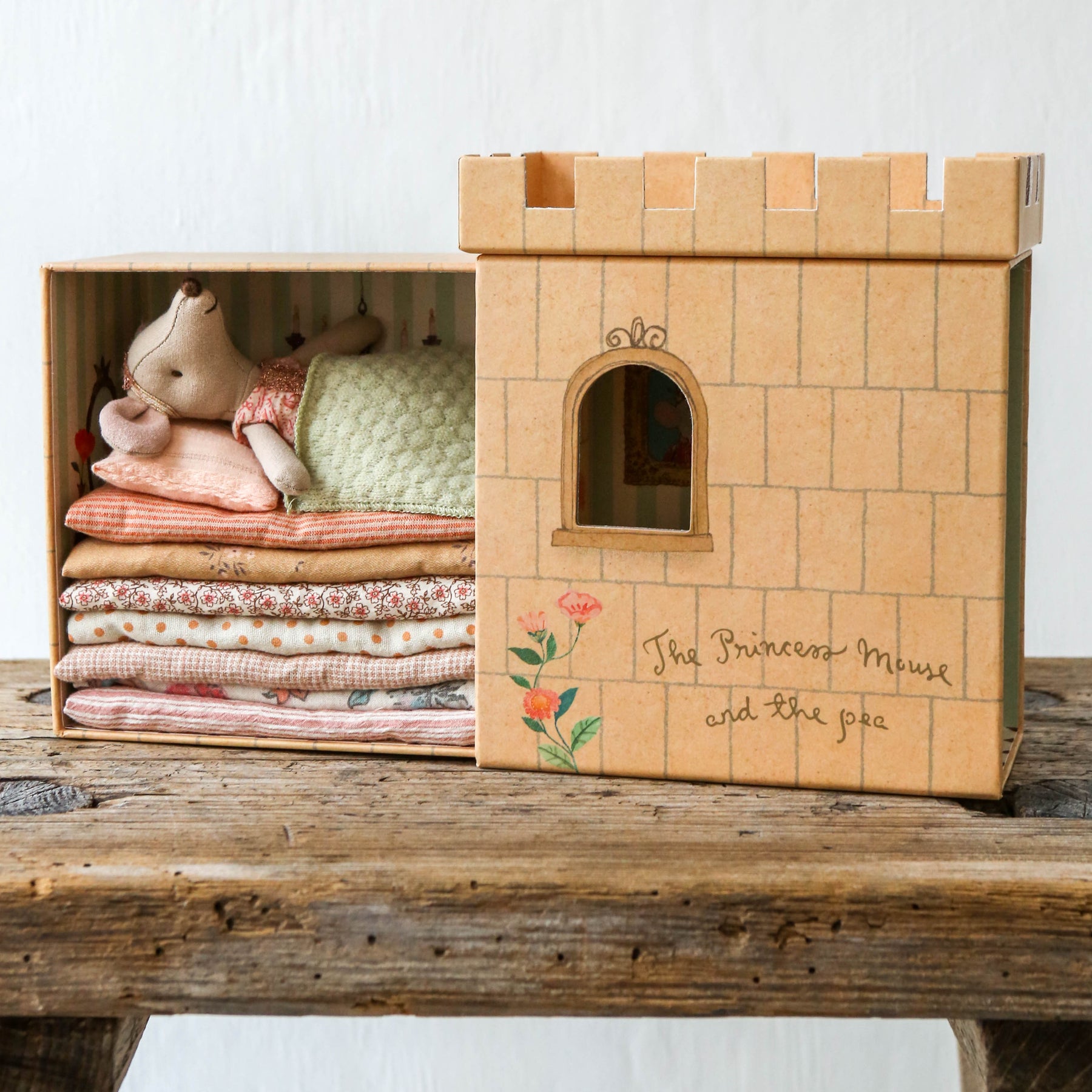 Once upon a time… Playset inspired by the famous fairy tale Princess and the pea. This set includes a castle with mattresses, a pea and a princess mouse.