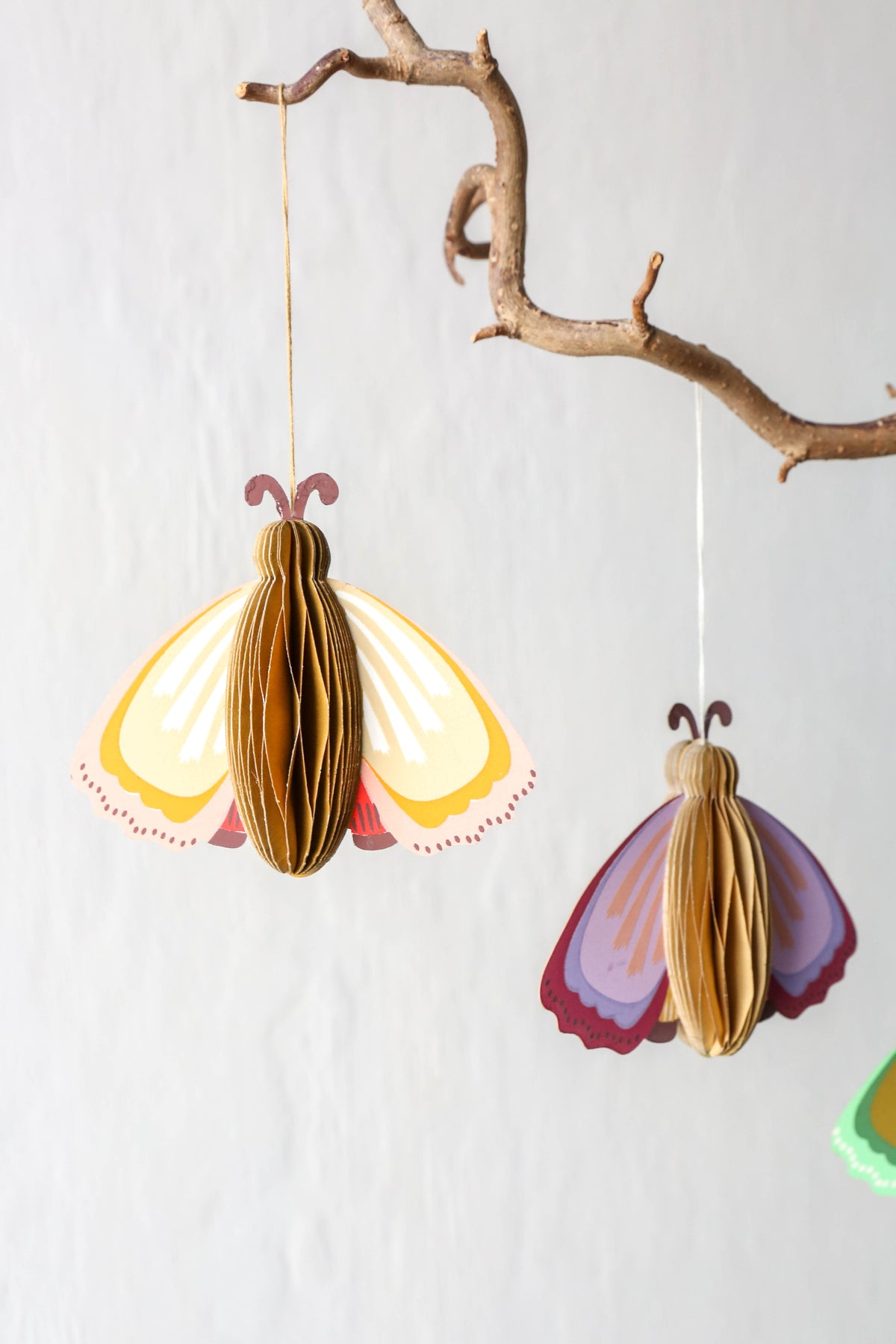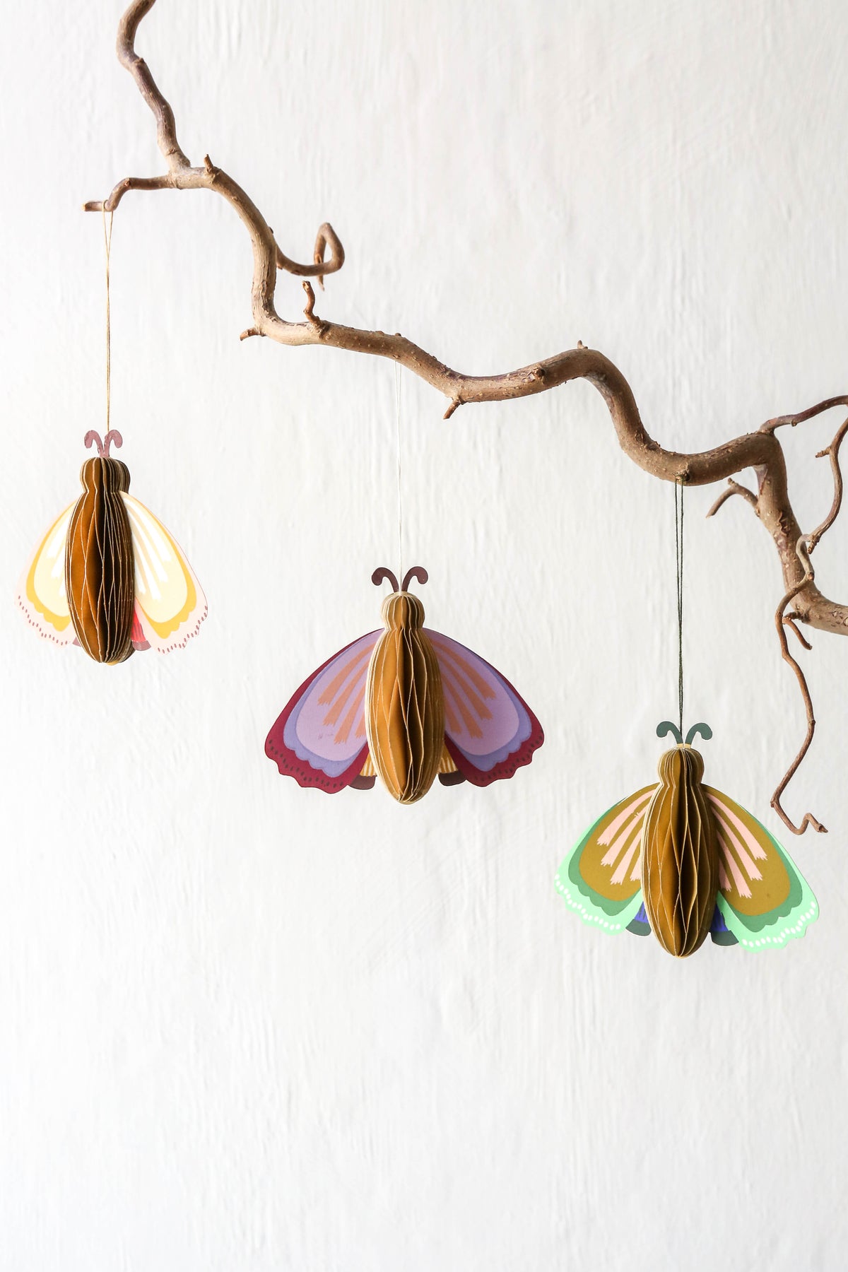 Set of 3 delicate honeycomb paper decorations with a butterfly design.