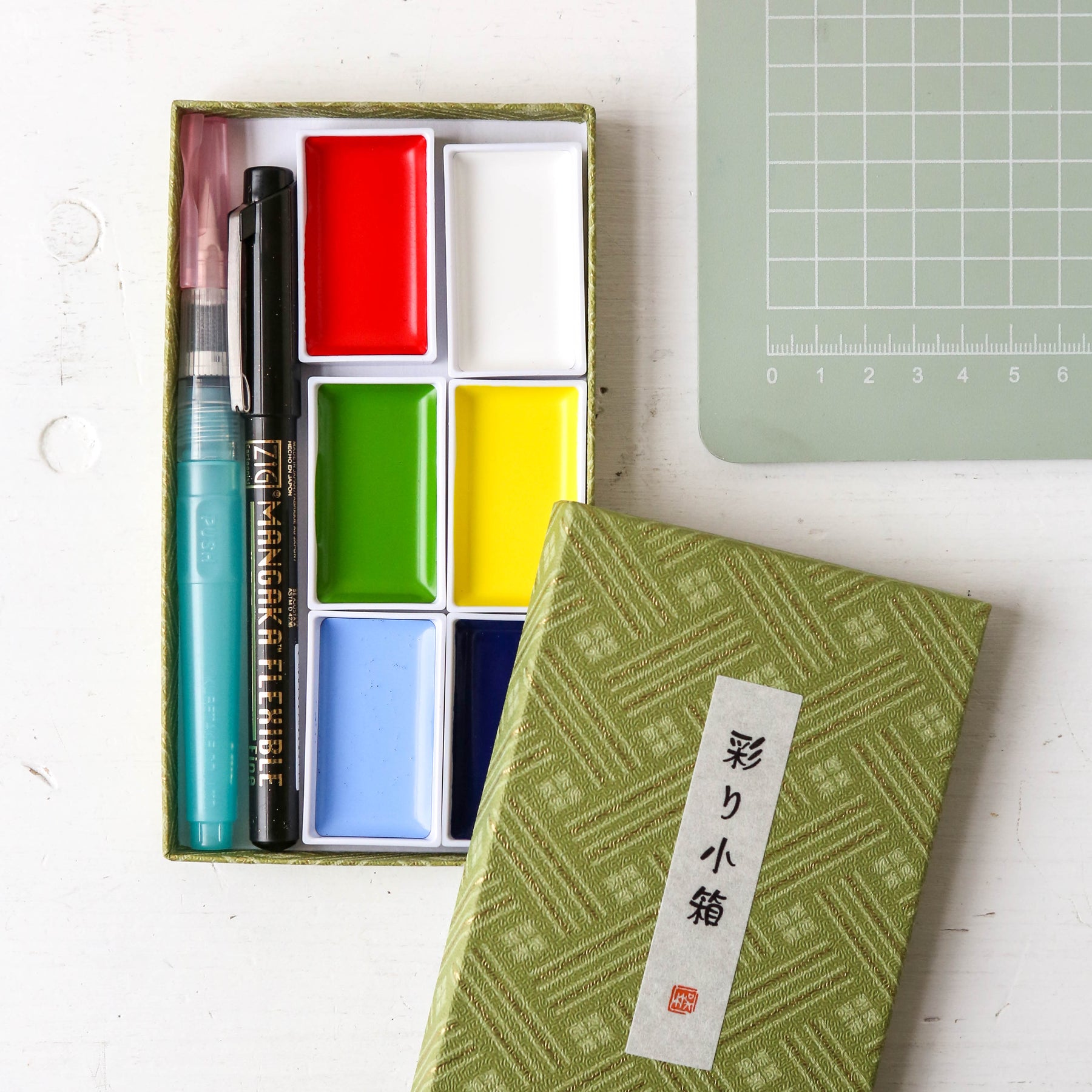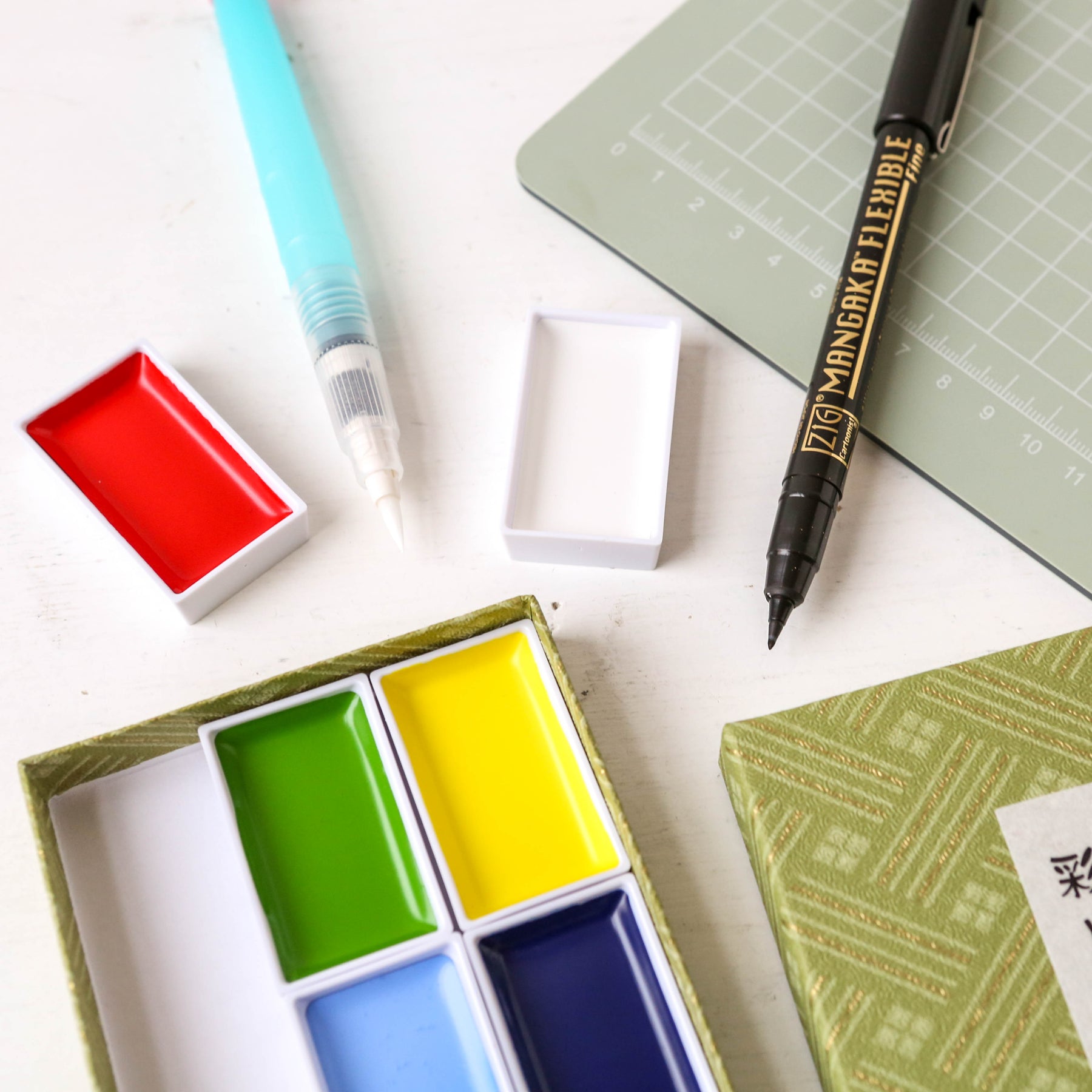 This is the 6-colour sketching set, including a basic selection of six popular Gansai pans. Also included are a Kuretake water brush, which makes it easier to sketch on the go, and a pigment brush pen for waterproof line work.