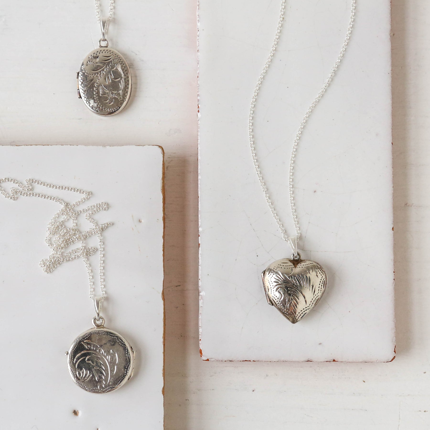 A solid silver vintage locket, cleaned and polished by us and hung on a silver chain.