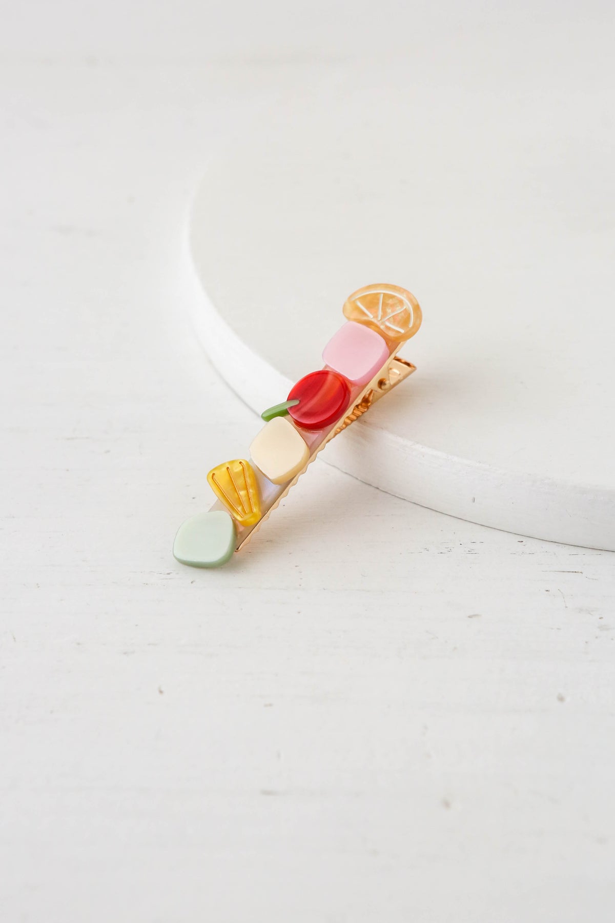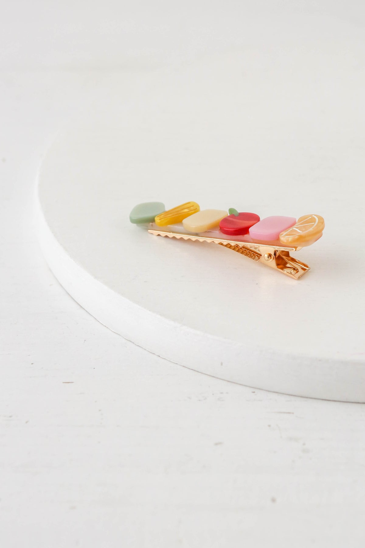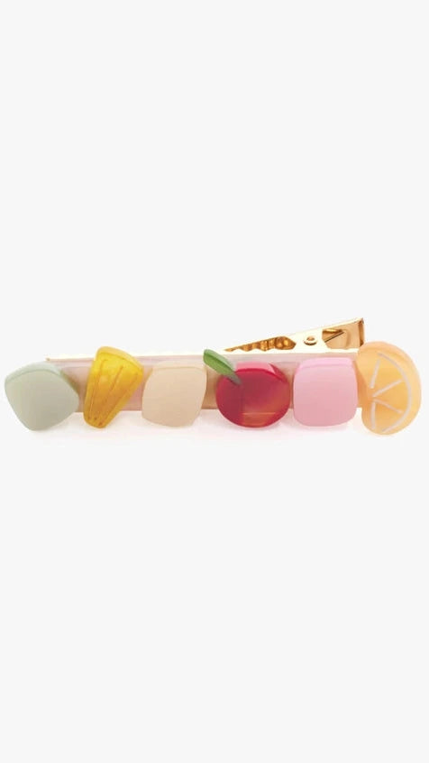 This deliciously cute hair clip is inspired by the beloved, but controversial ambrosia salad. Made from individually cut peices of cellulose acetate, making each one unique. Featuring a gold alligator clip backing.