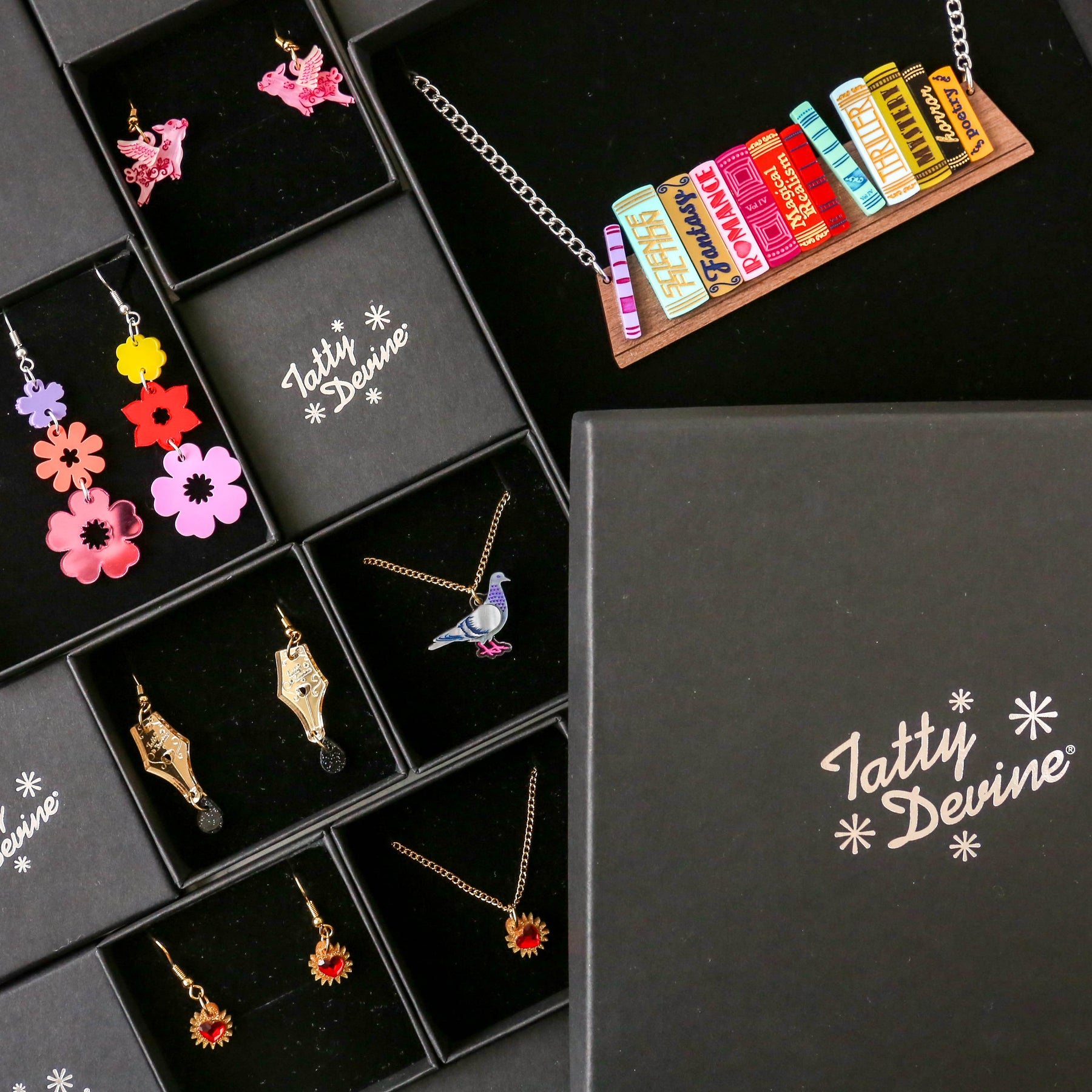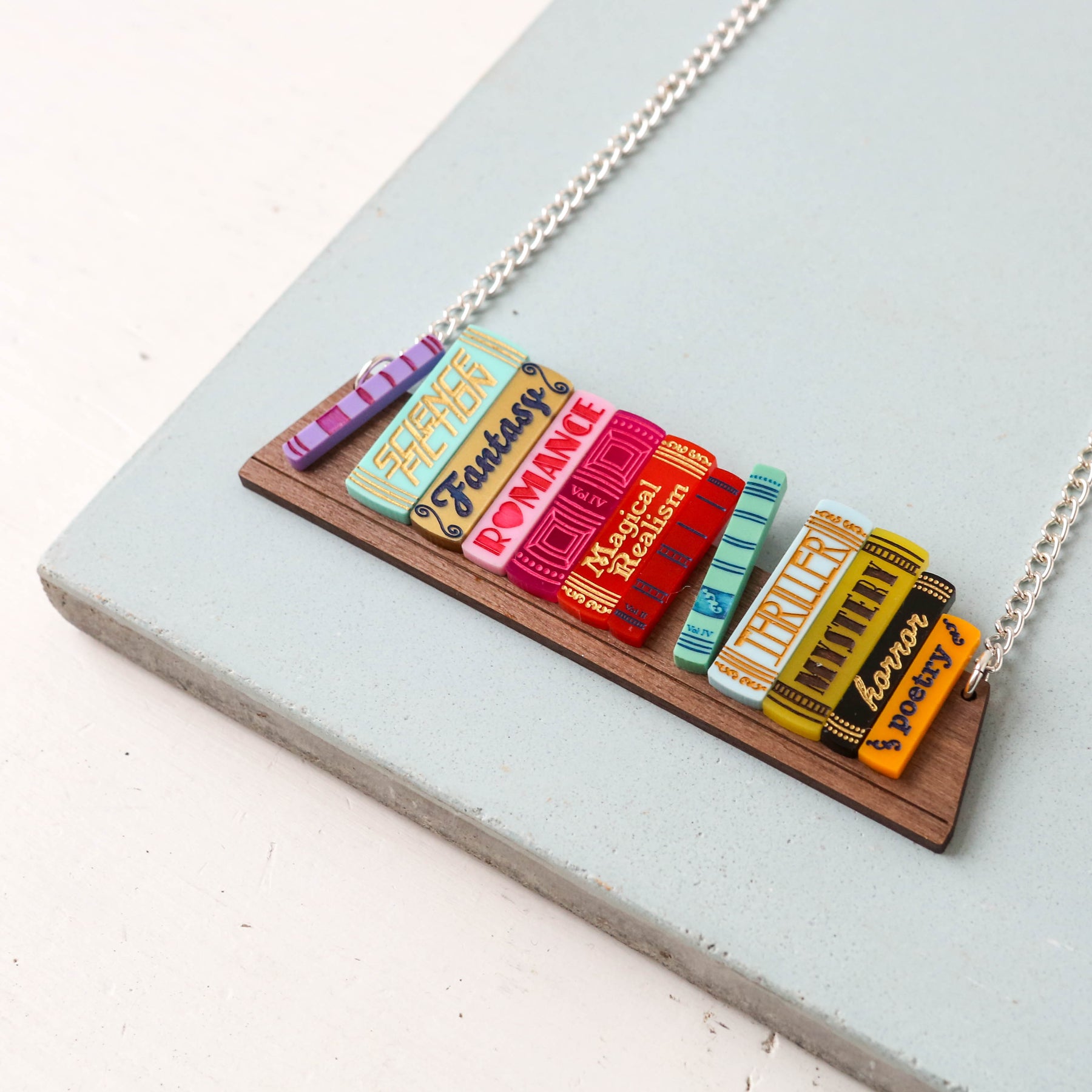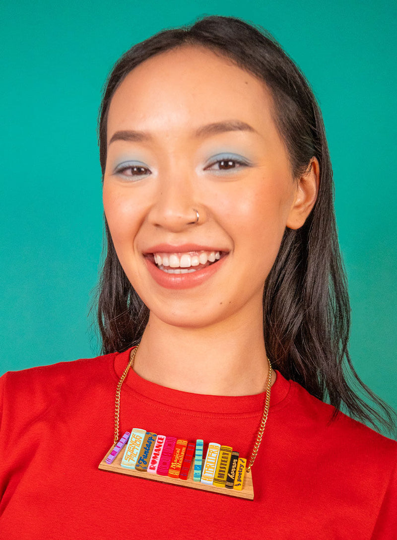 Never be without your favourite book in our rainbow-splashed Bookshelf Necklace. Fully stocked: we’ve recreated a look into our bookcase with our favourite genres, laser cut in 12 shades of glossy bright-coloured acrylic. Sitting atop a walnut wooden shelf, are you reading Sci-Fi and Fantasy or a mix of Romance and Mystery?