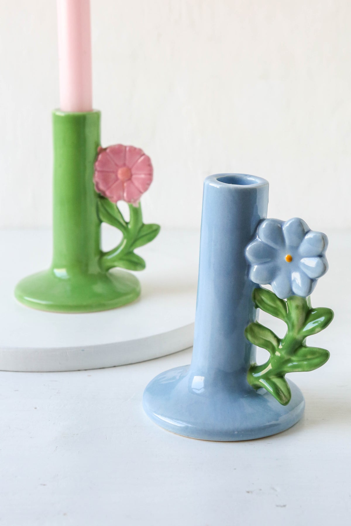 Retro-inspired ceramic flower candle holders. Suitable for dinner candles.